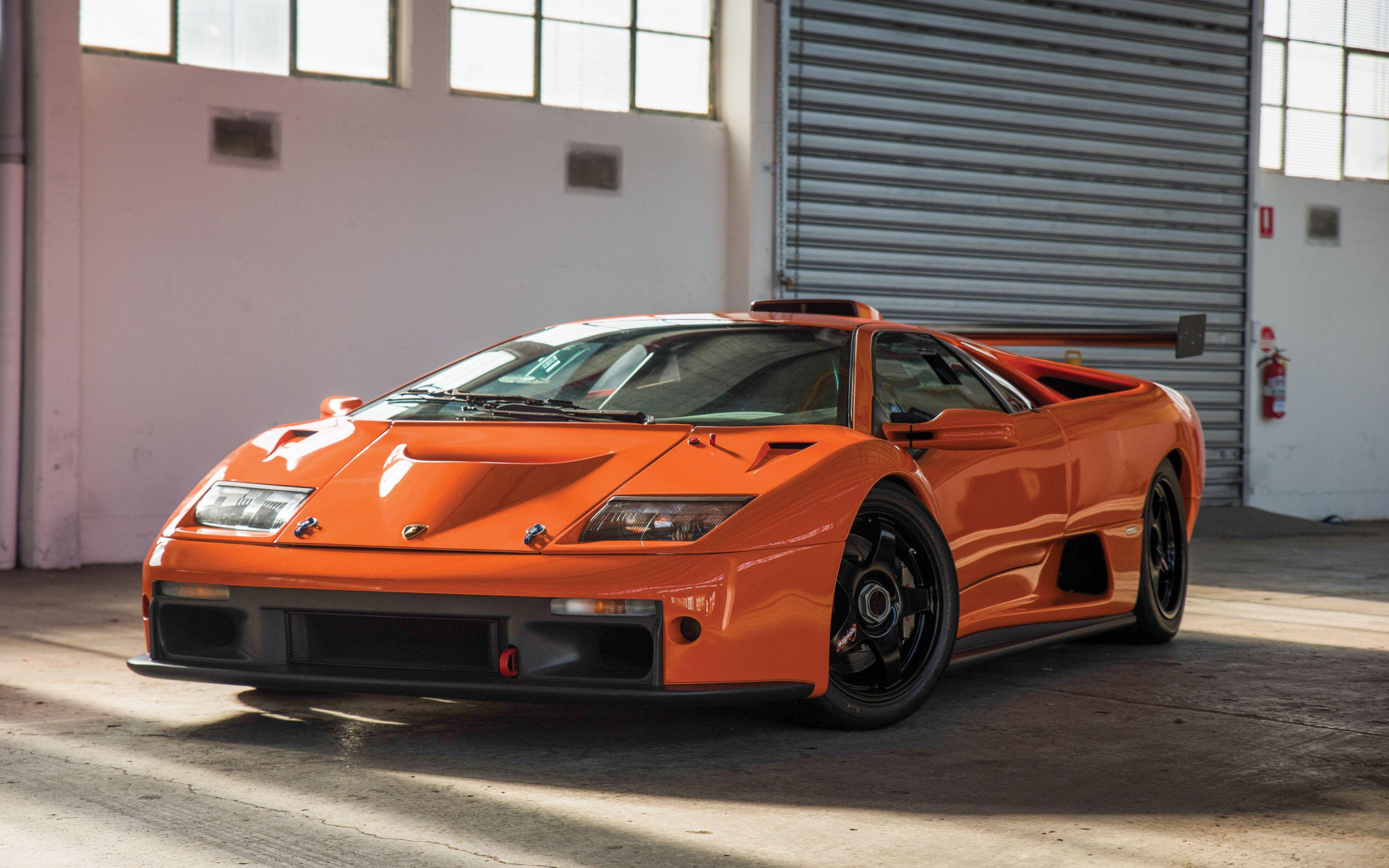 Description: A orange sports car parked in a garage next to a garage door and a roller door with a roller door.