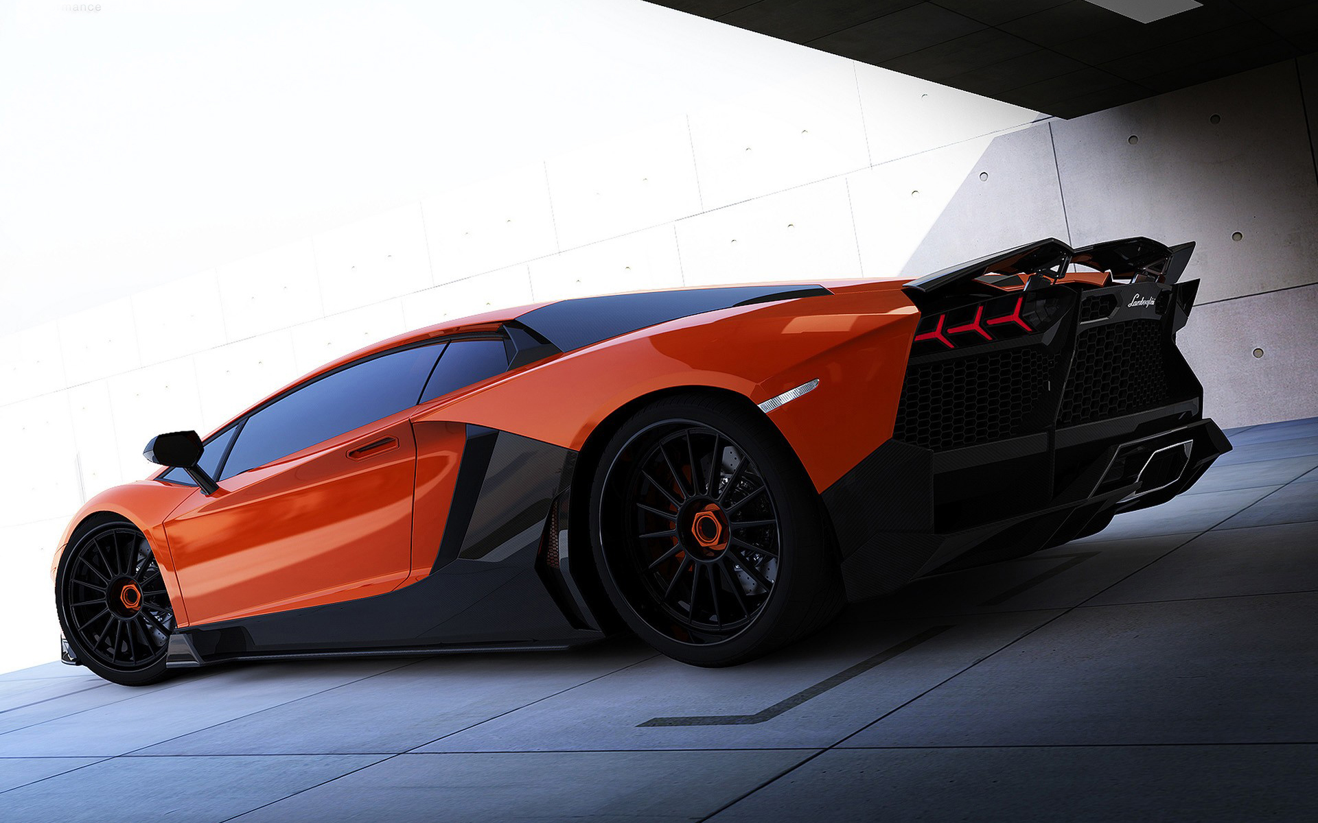 Description: A very nice looking orange sports car parked in a garage with a white wall behind it and a black floor.