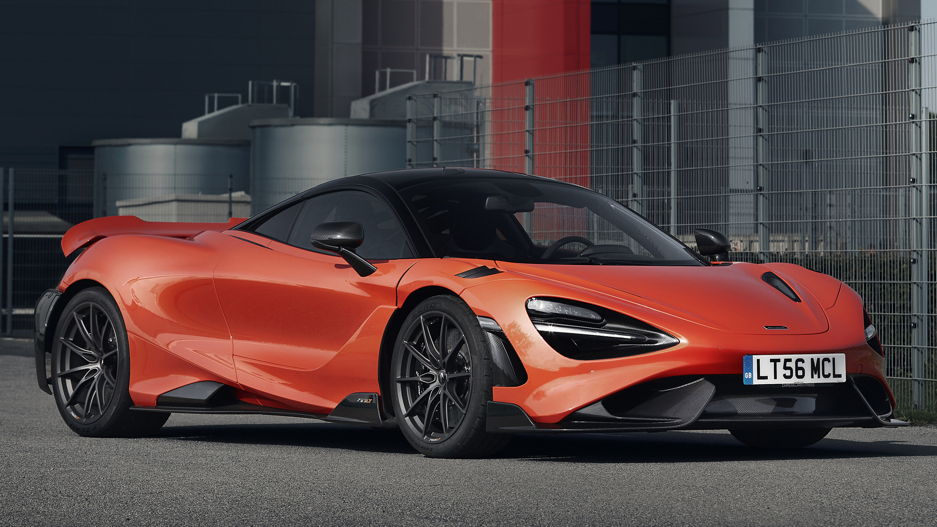 Description: A orange sports car parked in front of a building with a red sign on it's side of the car.