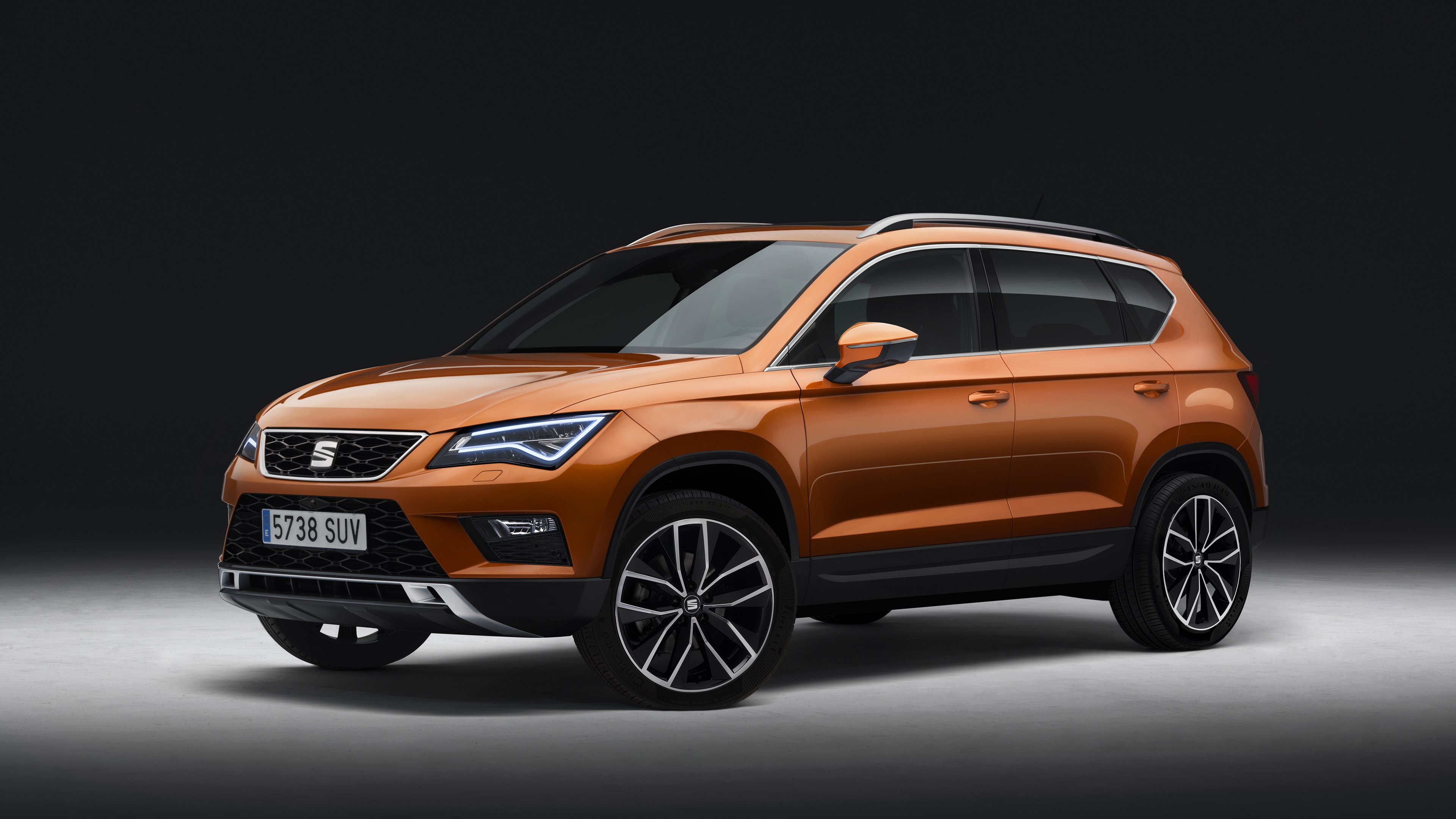 Description: A orange suv is shown in a dark room with a black background and a black background behind it is a black background.