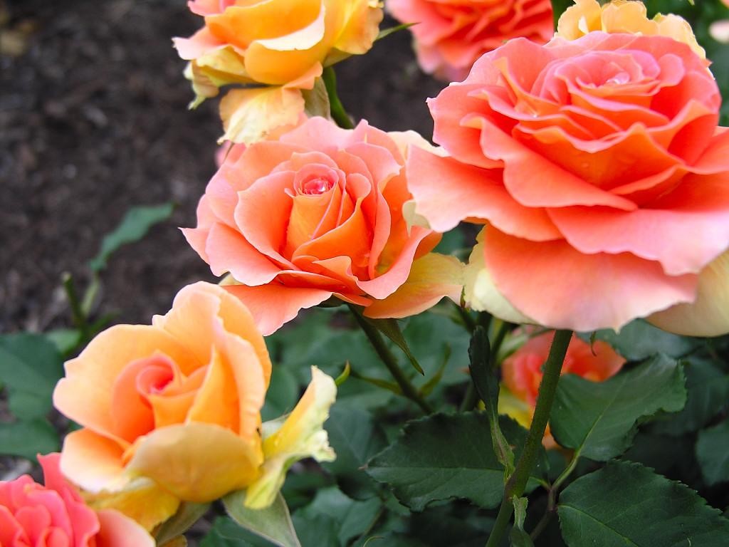 Description: A group of orange and yellow roses in a garden area with dirt in the background and a black ground.
