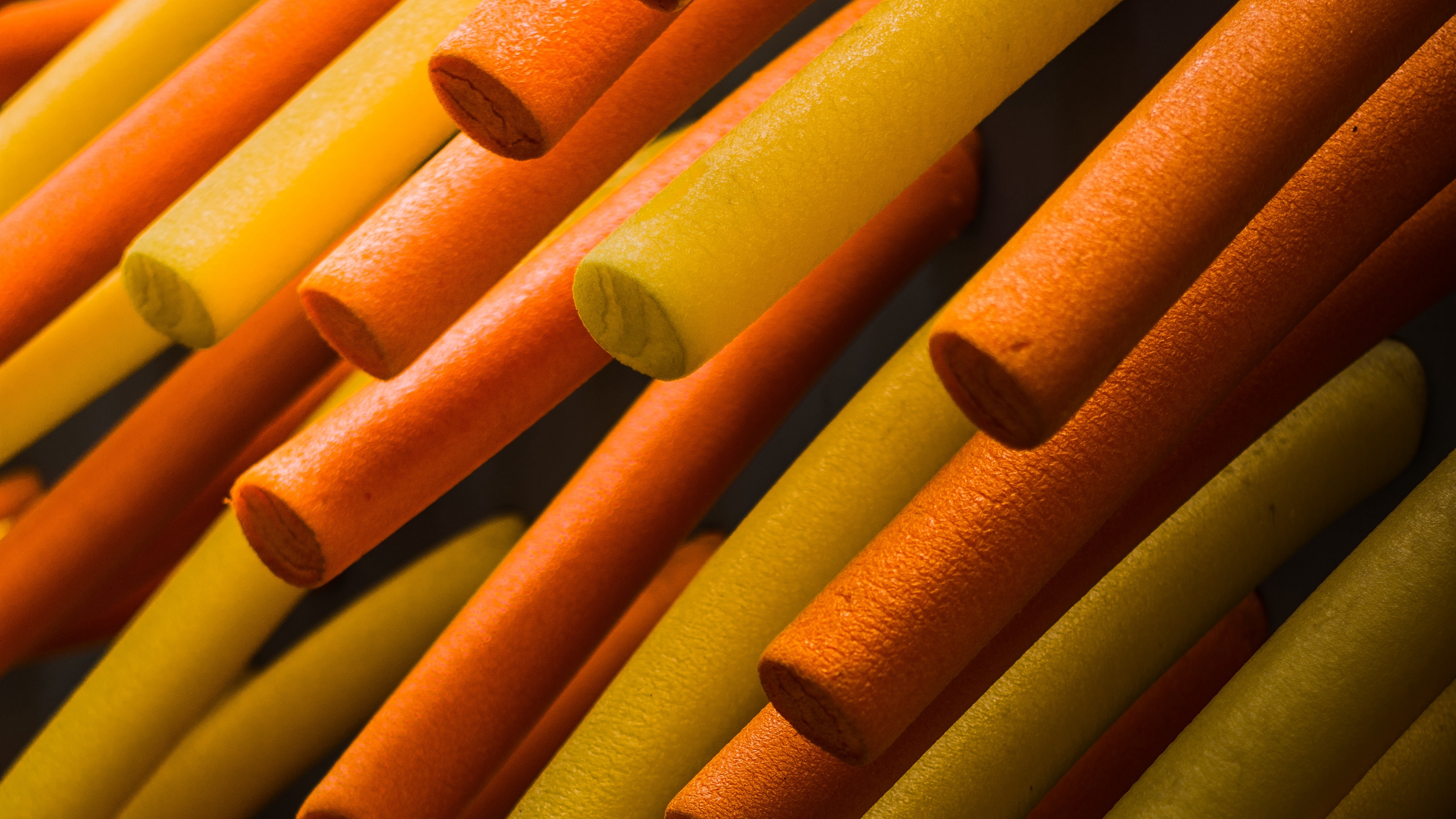 Description: A bunch of orange and yellow sticks are lined up together in a row on a wall in a store.