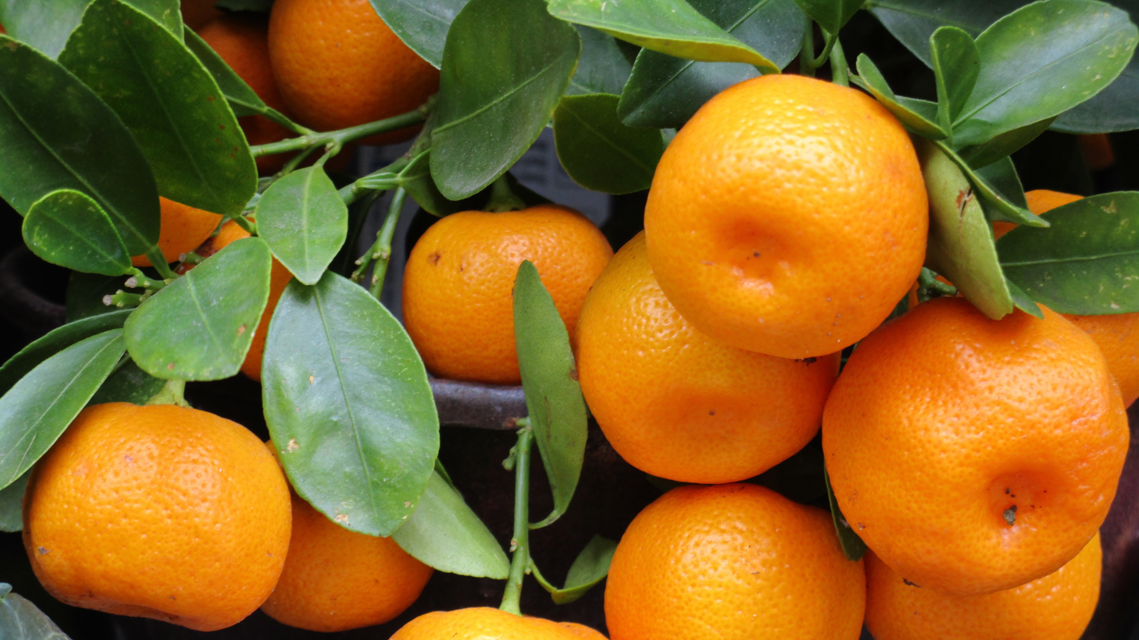 Description: A bunch of oranges are growing on a tree branch with leaves on it and a green leafy branch.