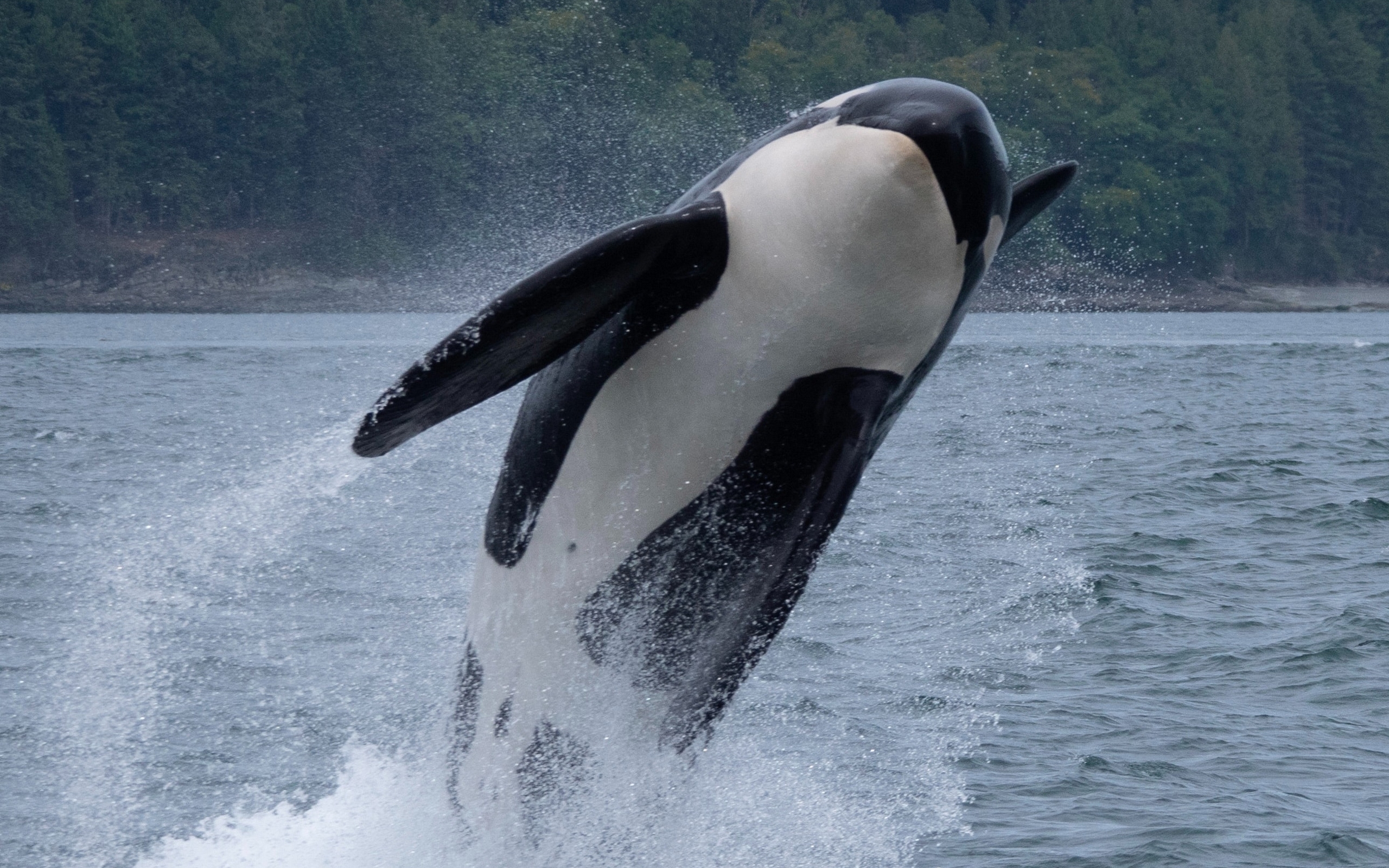 Description: A black and white orca jumping out of the water with its mouth open and it's head out of the water.