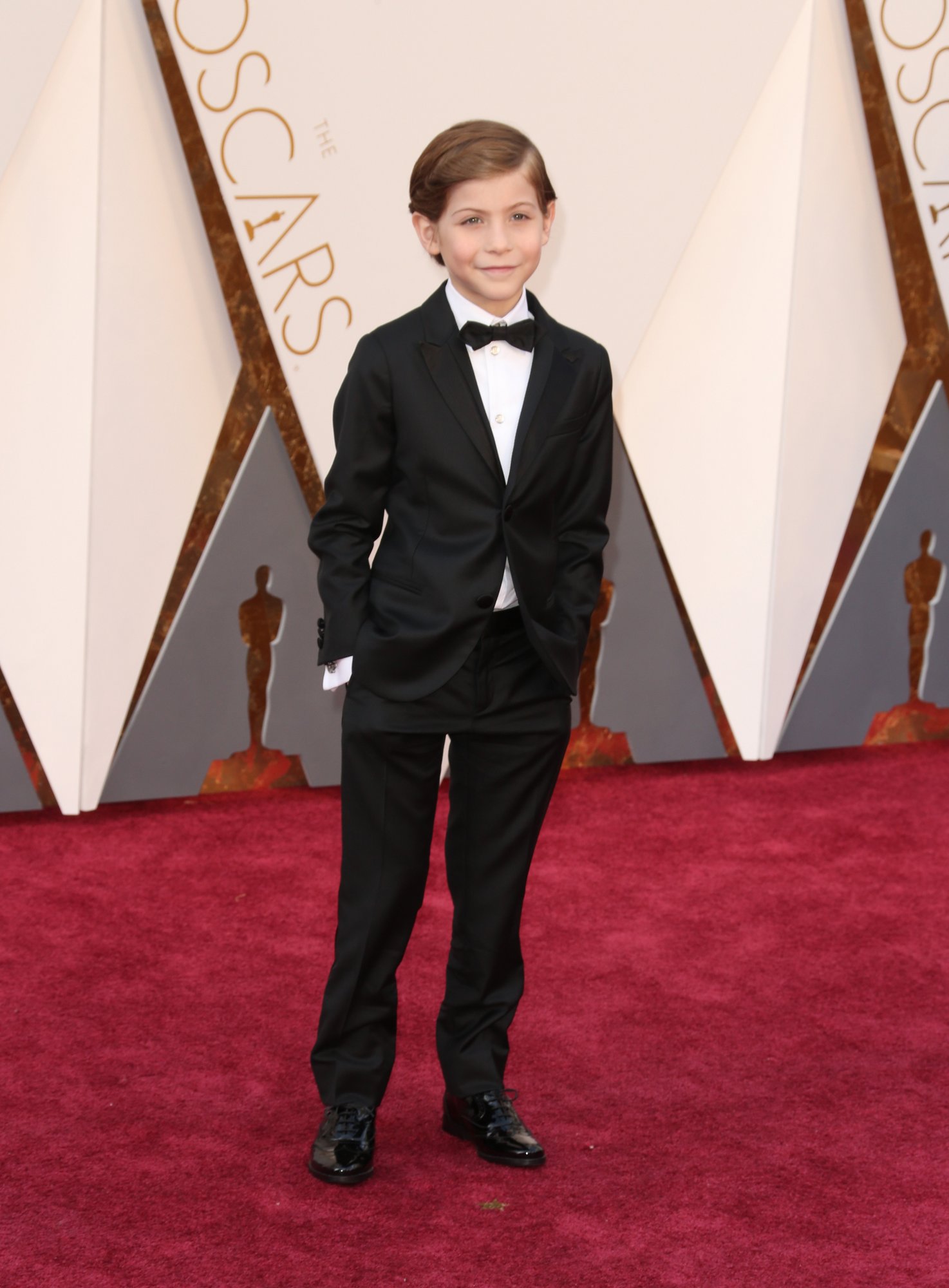Description: A young boy in a tuxedo and bow tie on the red carpet of an oscars event.