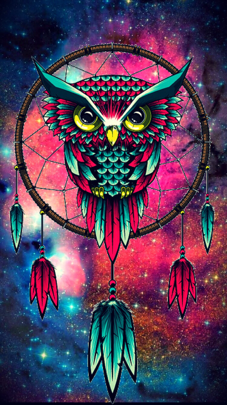 Description: An owl with a dream catcher in its hand and stars in the background.