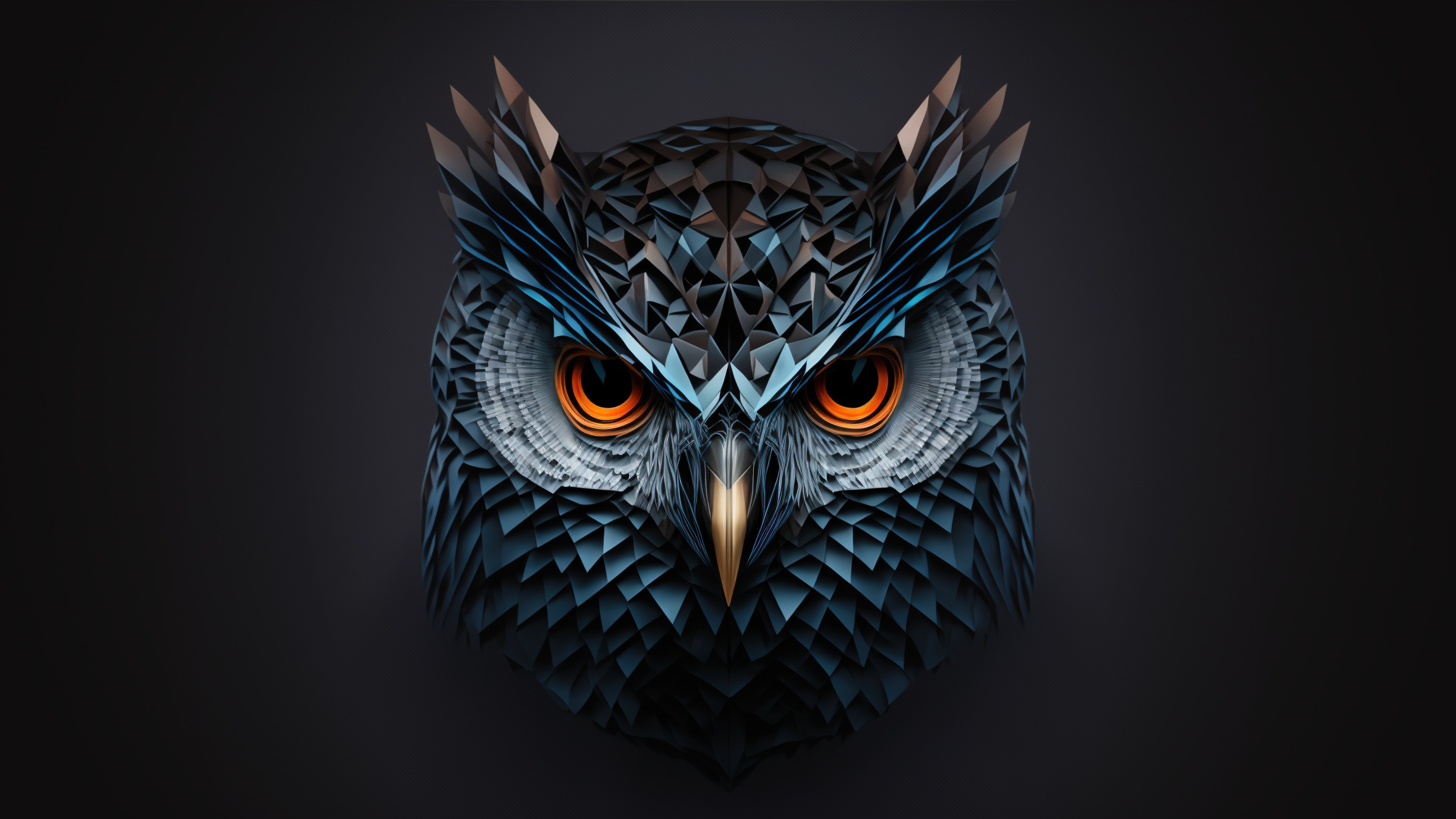 Description: An owl's head with orange eyes and a black background is featured in this image with a dark background.
