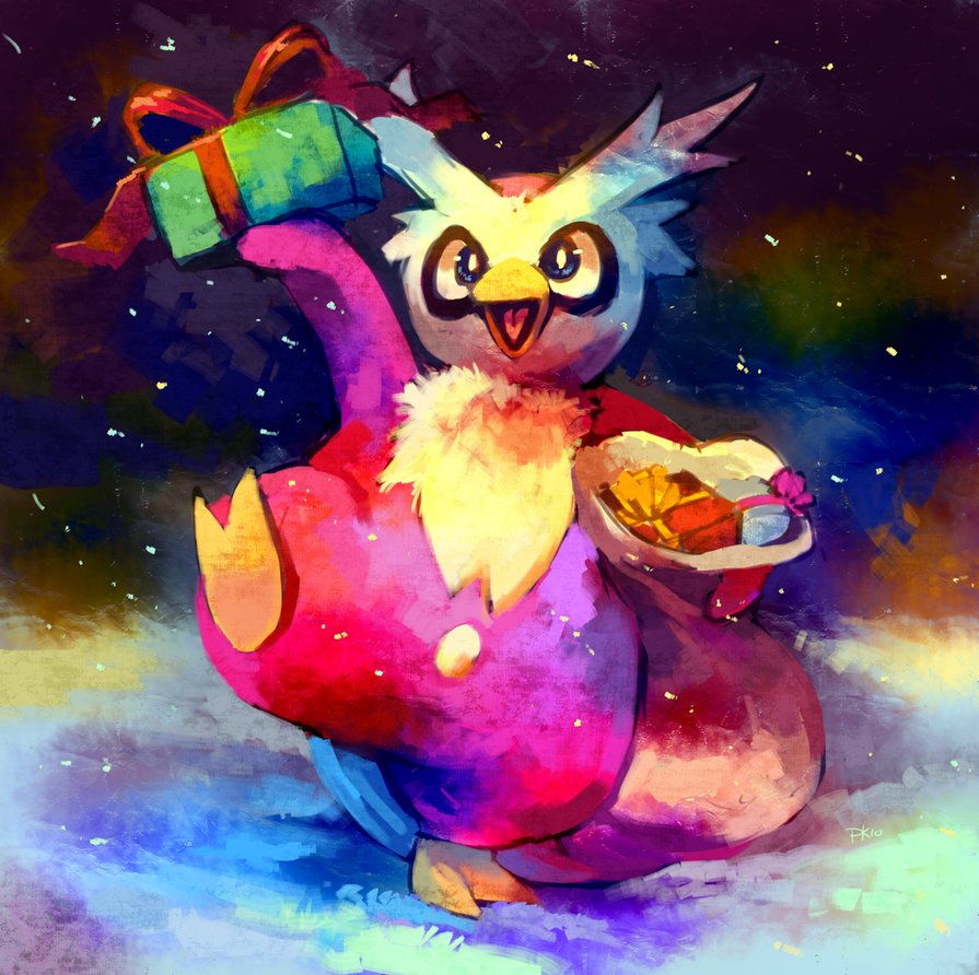 Description: A painting of an owl holding a plate of food in its paws and a gift wrapped in a bow.