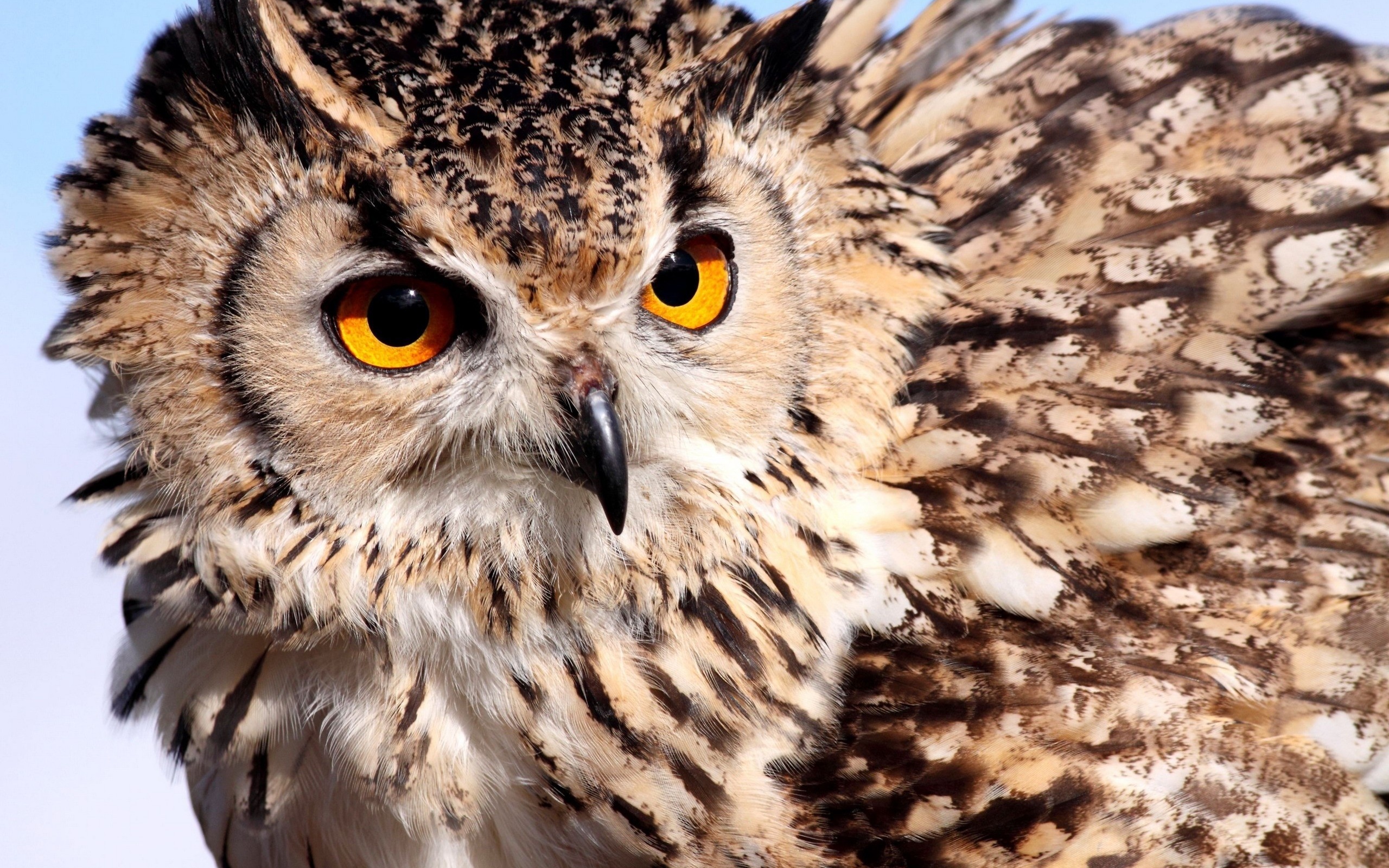 Description: A close up of an owl with a sky background behind it and a yellow eye patch in the center of the owl's head.