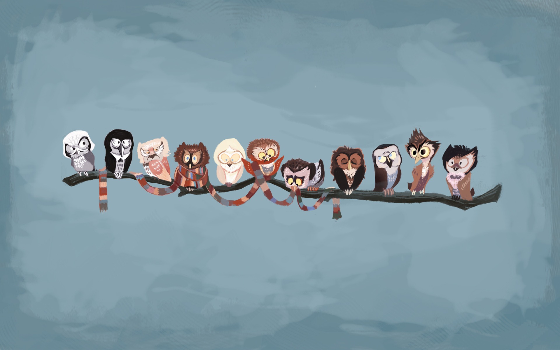 Description: A group of owls sitting on a branch with a ribbon around their necks and eyes drawn on it's sides.