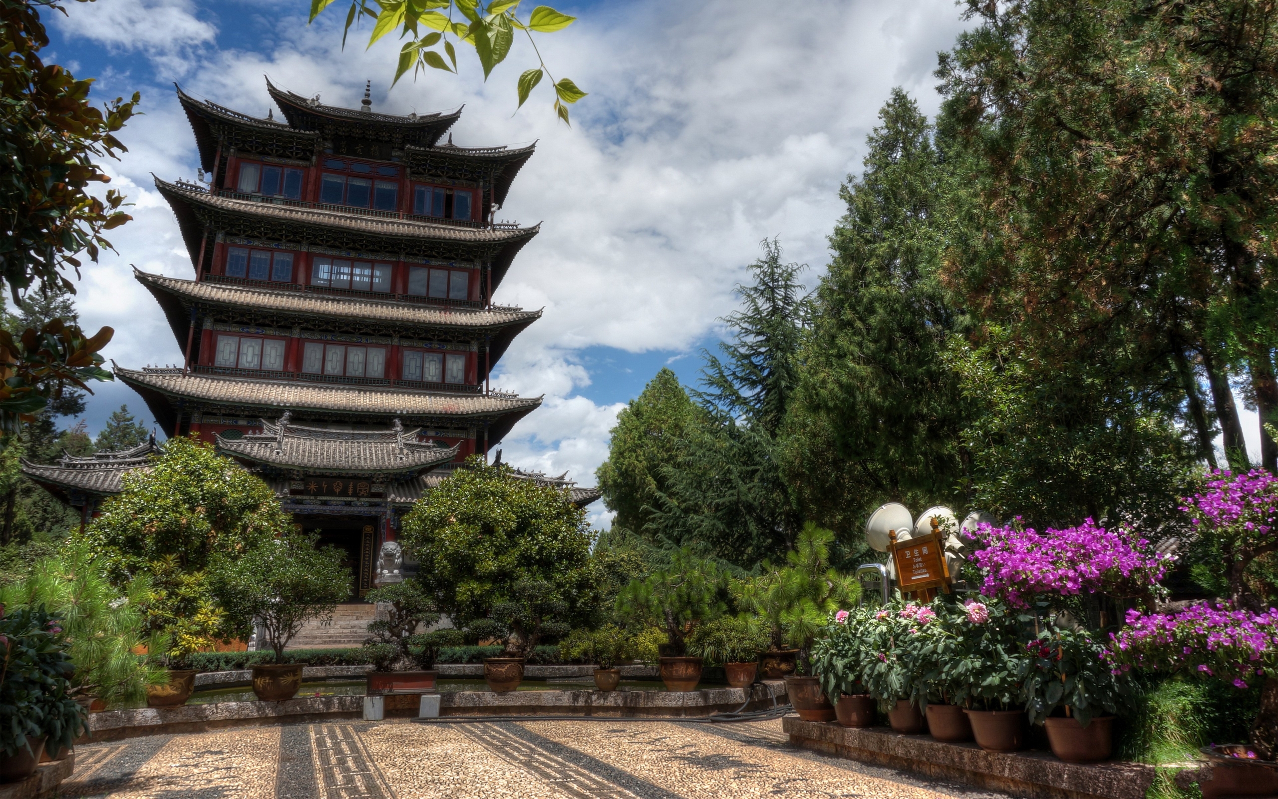 Description: A pagoda in a garden with potted plants and flowers in front of it and a sky background with clouds.