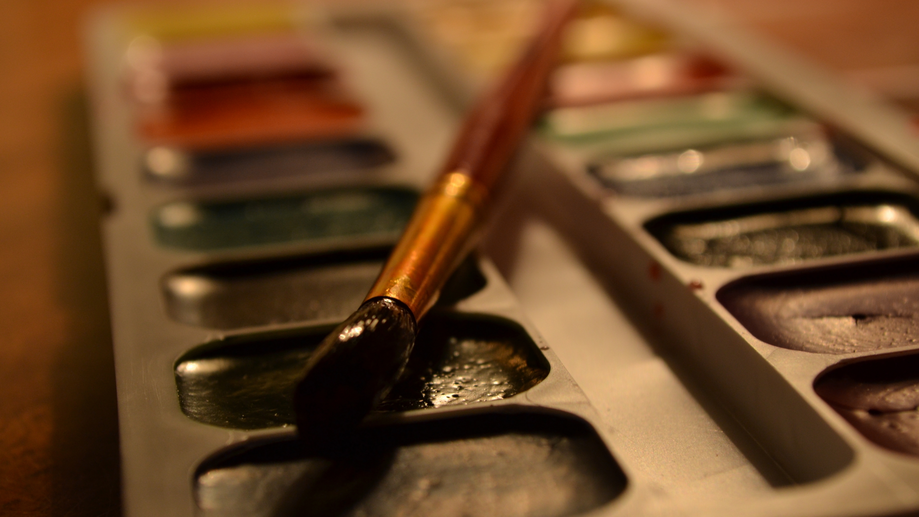 Description: A close up of a paint palette with a brush on it and a palette of paint in the background.