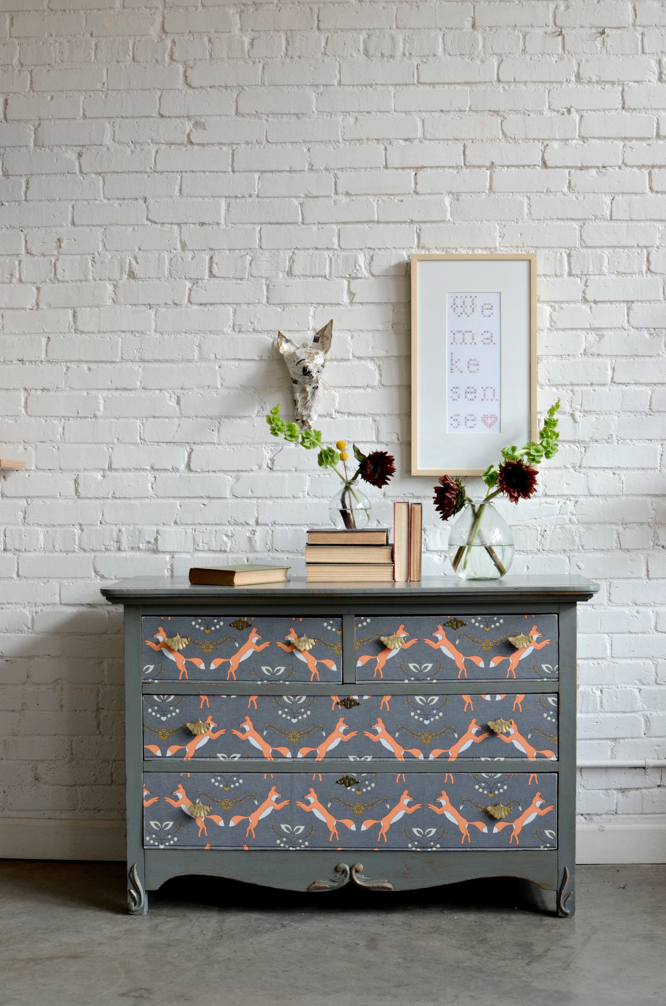 Description: A painted dresser with a book and flowers on top of it next to a brick wall with a picture frame.