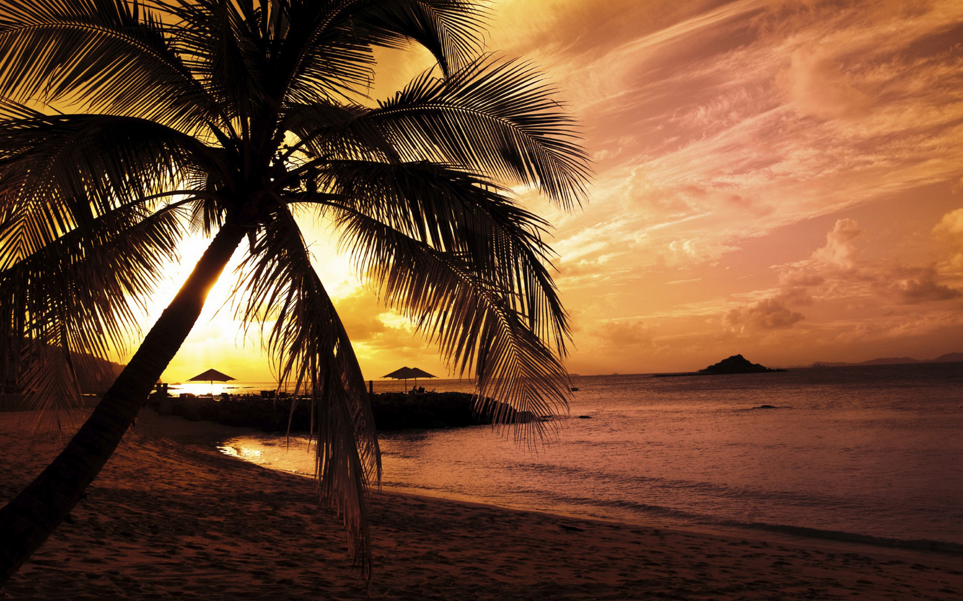 Description: A palm tree on a beach with a sunset in the background and a small island in the distance with a boat in the water.