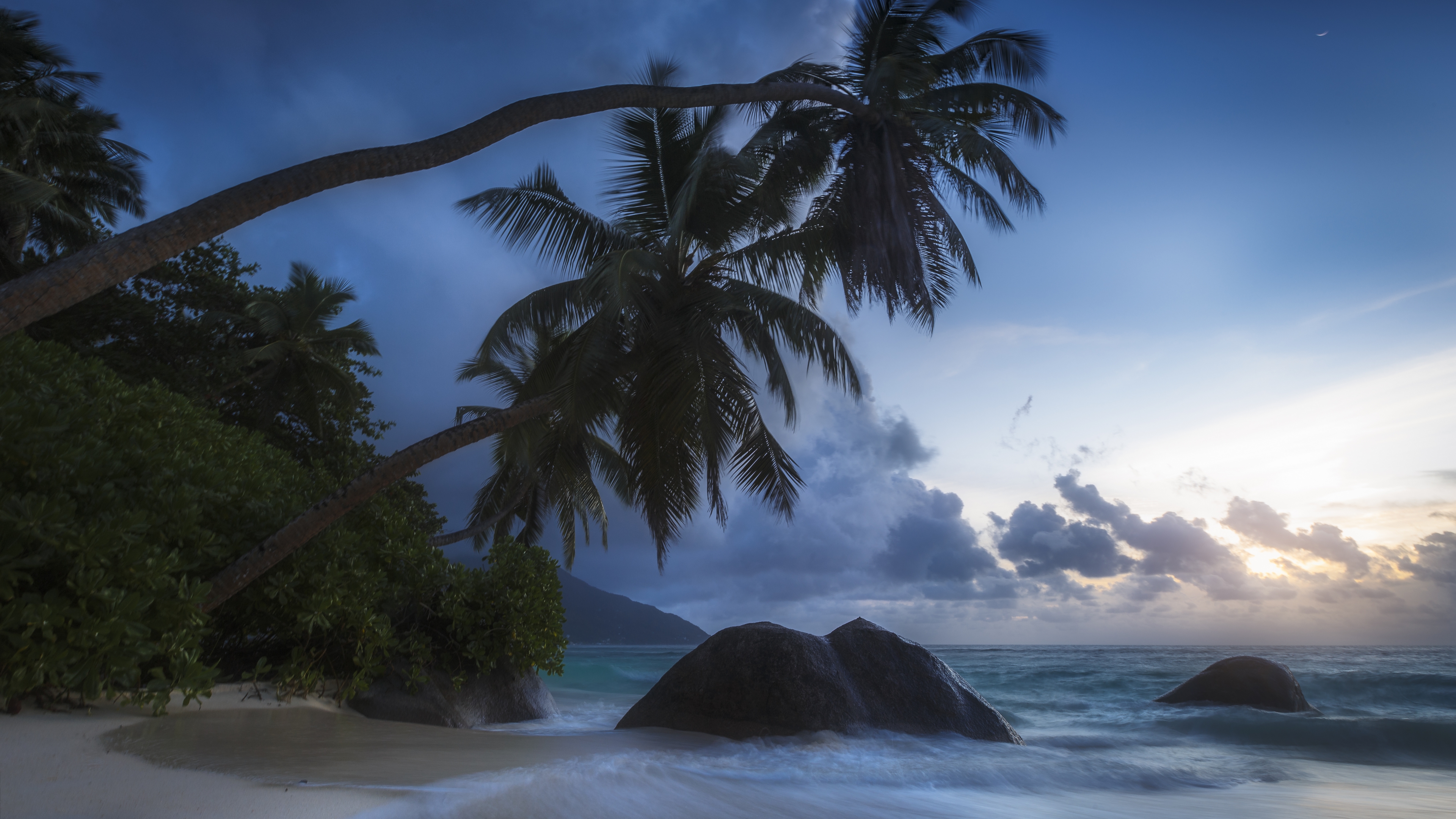 Description: A palm tree on a beach with waves crashing in front of it and a rock in the foreground.