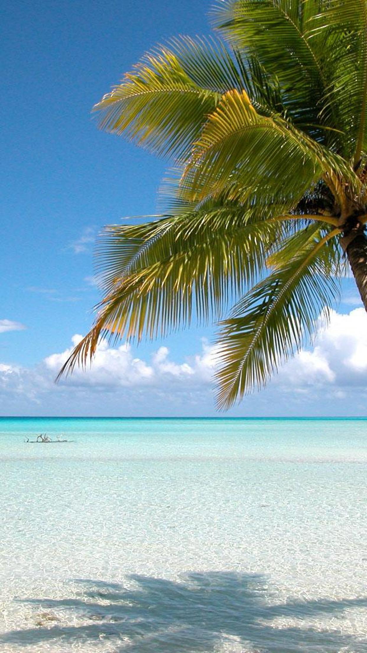 Description: A palm tree on a beach with a boat in the distance and a blue sky in the background with clouds.
