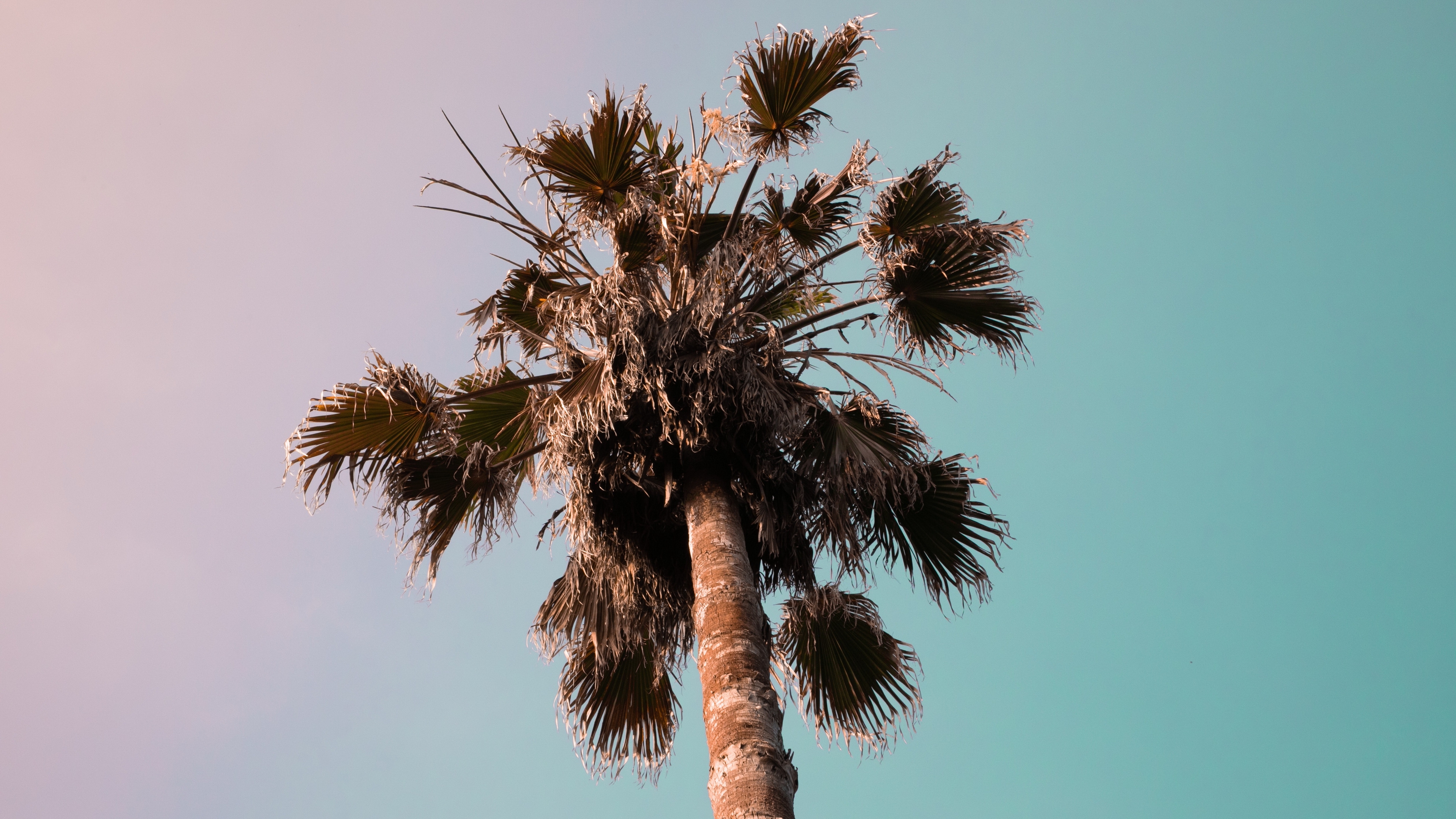 Description: A palm tree with a blue sky in the background and a few clouds in the sky above it.