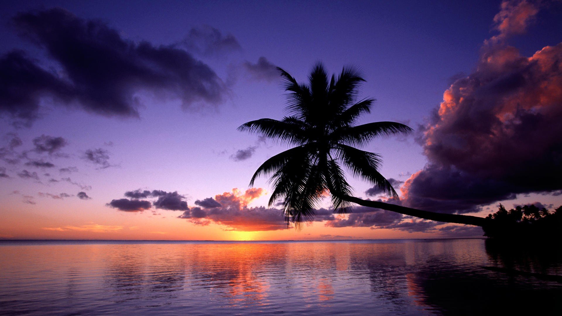 Description: A palm tree is silhouetted against a sunset over the ocean with clouds in the sky and a body of water.