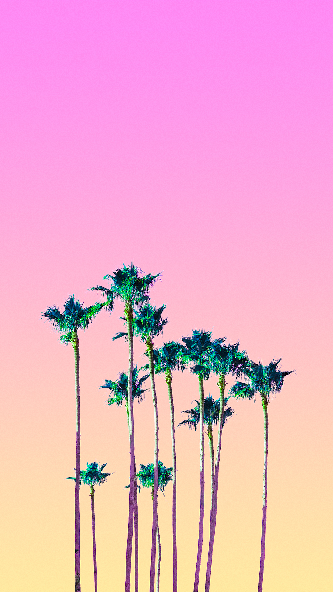 Description: A group of palm trees against a pink sky background with a pink sky in the background and a pink sky in the foreground.
