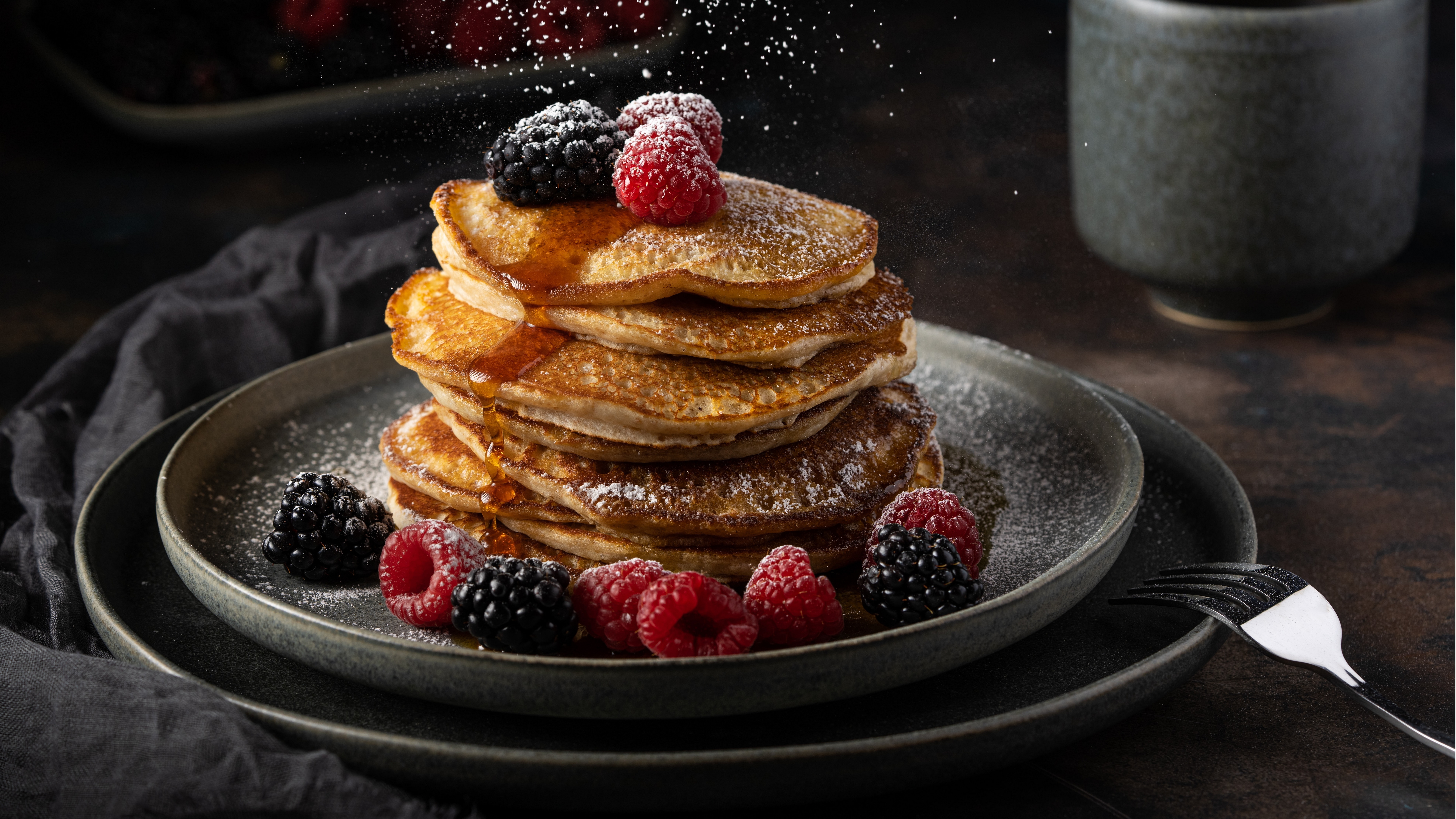 Description: A stack of pancakes with berries and powdered sugar on top of them on a plate with a fork.