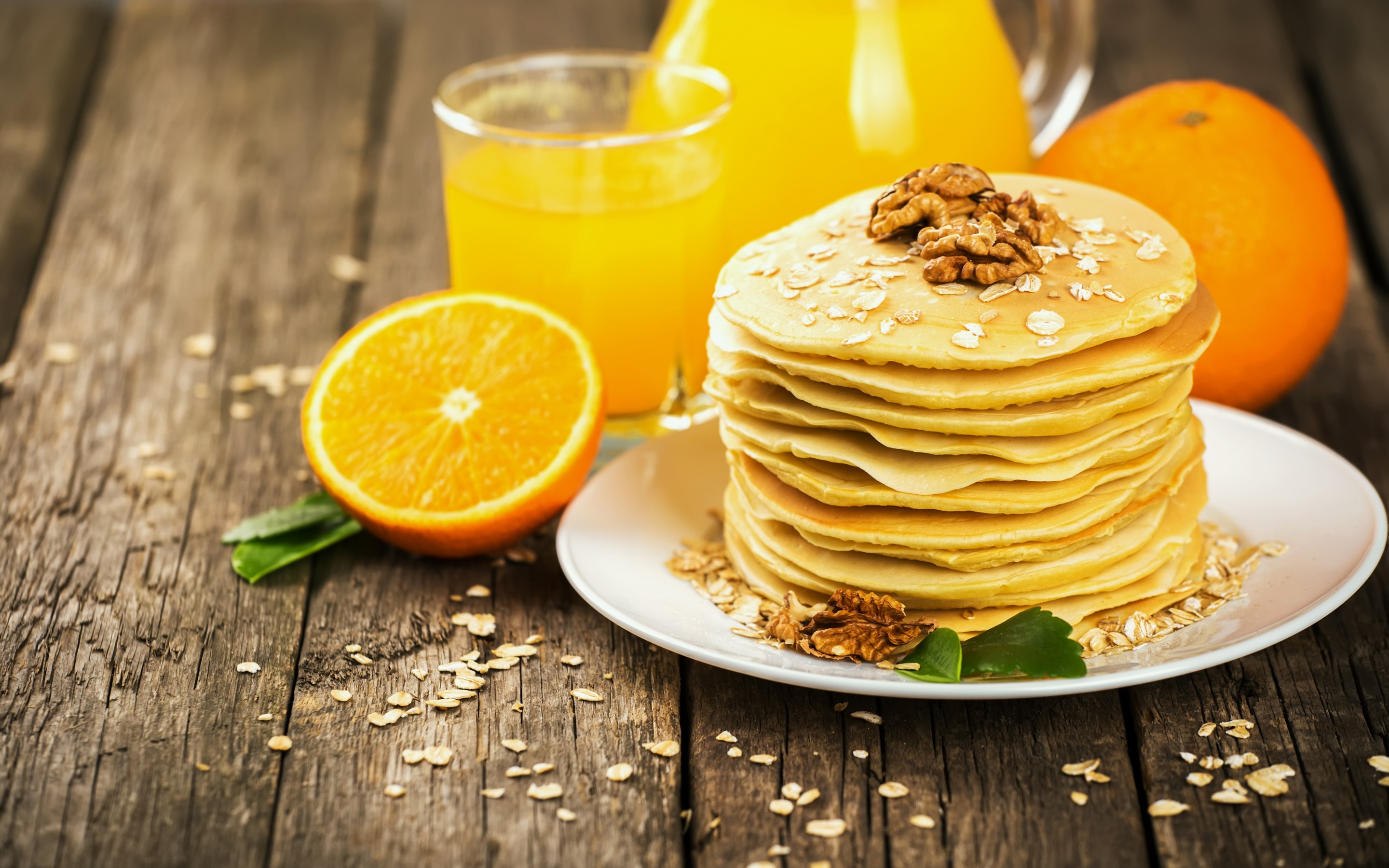 Description: A stack of pancakes with nuts on top of them next to oranges and a pitcher of orange juice.