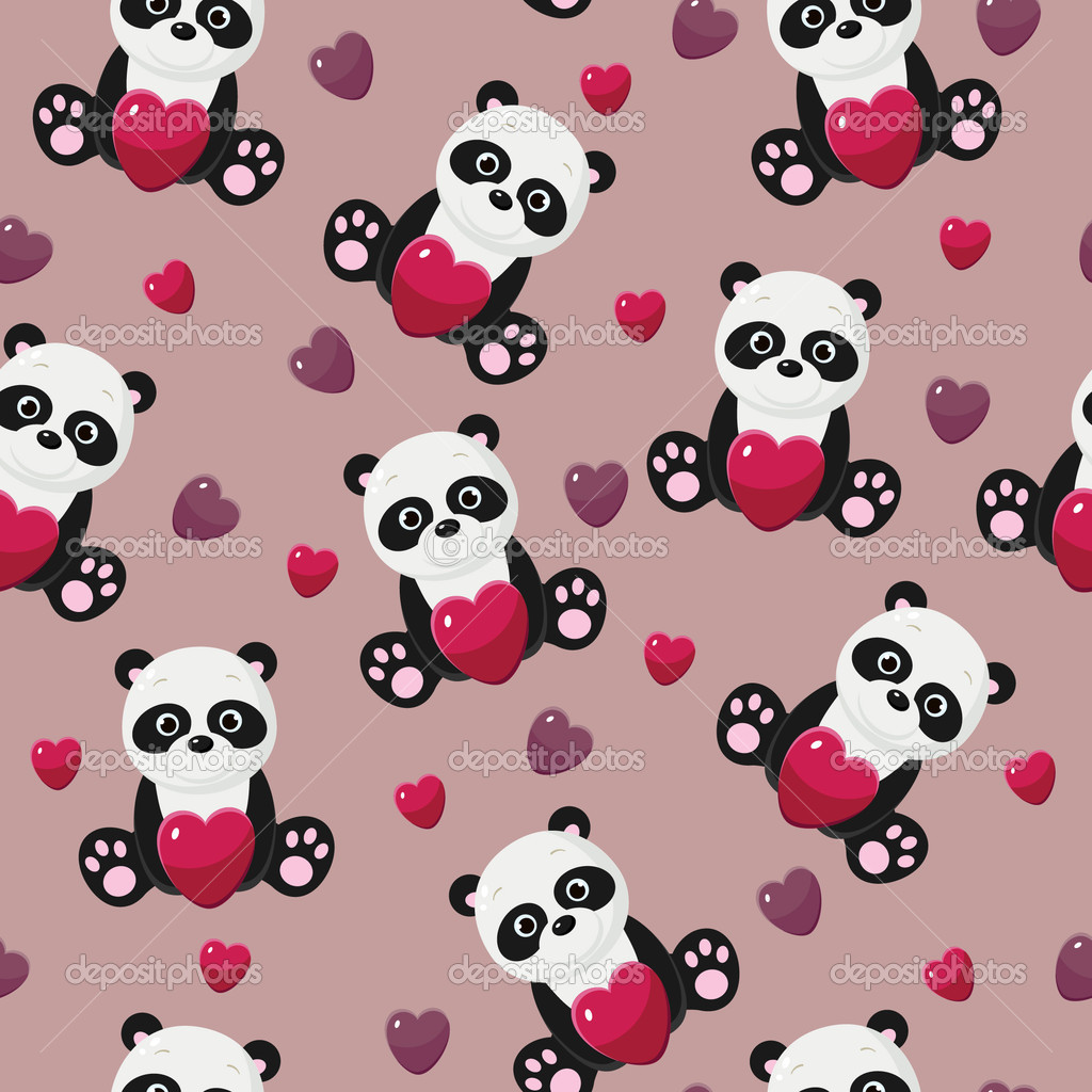 Description: A panda bear with a heart in its paws on a pink background with hearts and hearts in the shape of hearts.