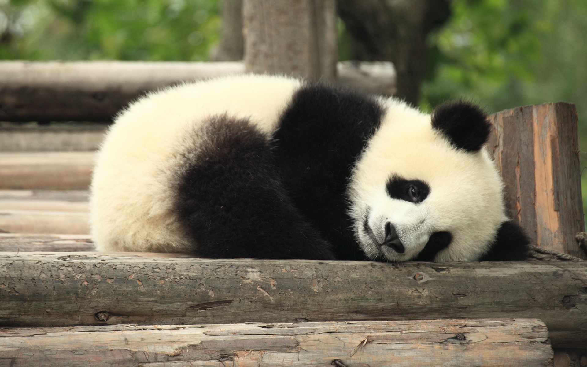 Description: A panda bear laying on a wooden platform in a zoo enclosure with trees in the background and a log in the foreground.