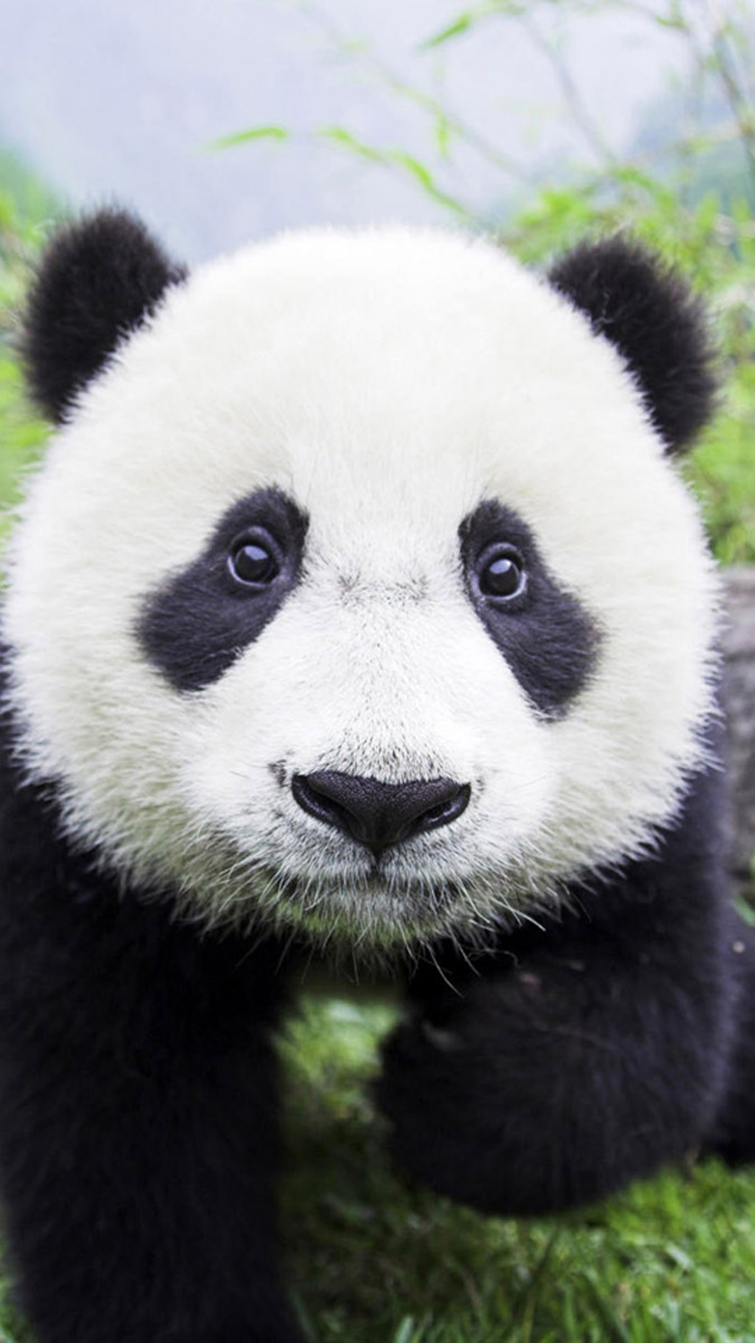 Description: A panda bear sitting on top of a lush green field of grass and looking at the camera with a sad look on his face.
