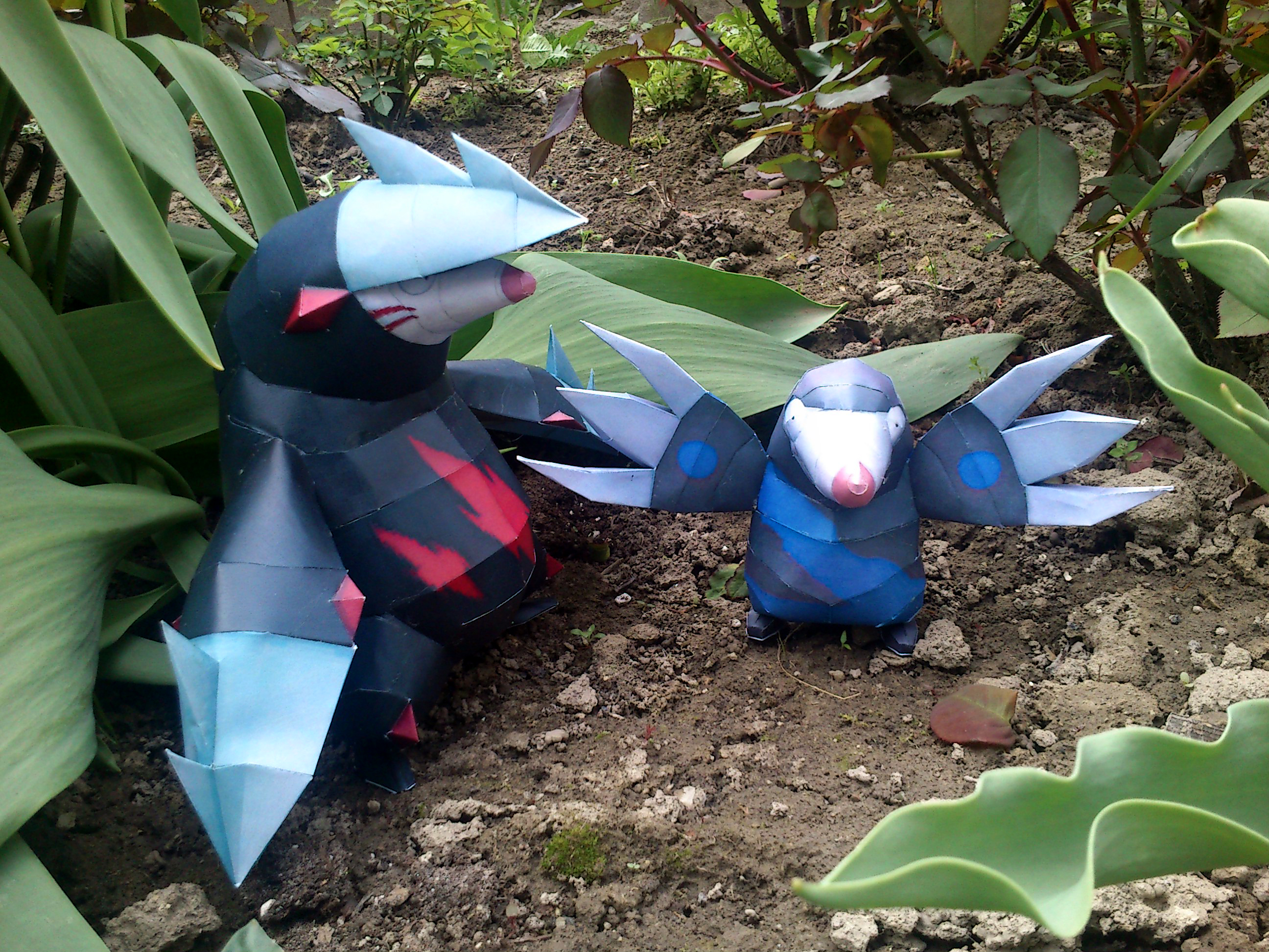 Description: Two paper birds sitting on the ground next to plants and leaves in the dirt and dirt ground.