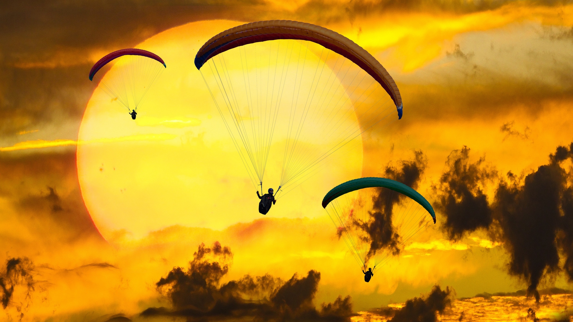 Description: A couple of paraglides are flying in the sky at sunset or sunrise with a sun setting behind them.