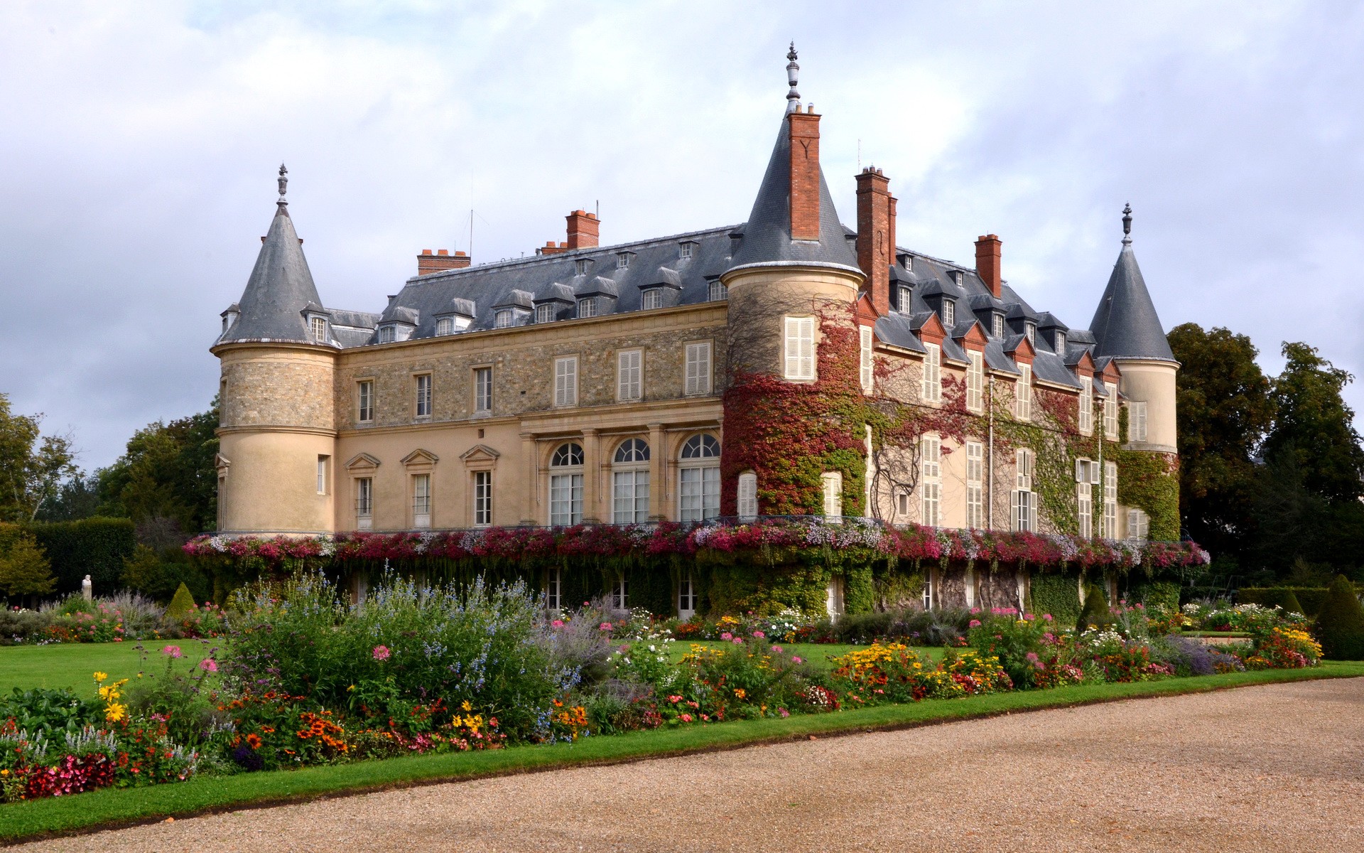 Description: A large building with a lot of flowers in front of it and a walkway leading to it and a walkway leading to the front of the building.