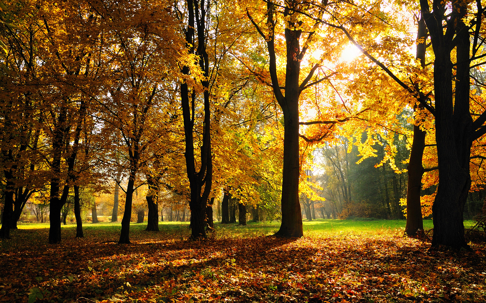 Description: A park with lots of trees and leaves on the ground and a bench in the middle of the park.