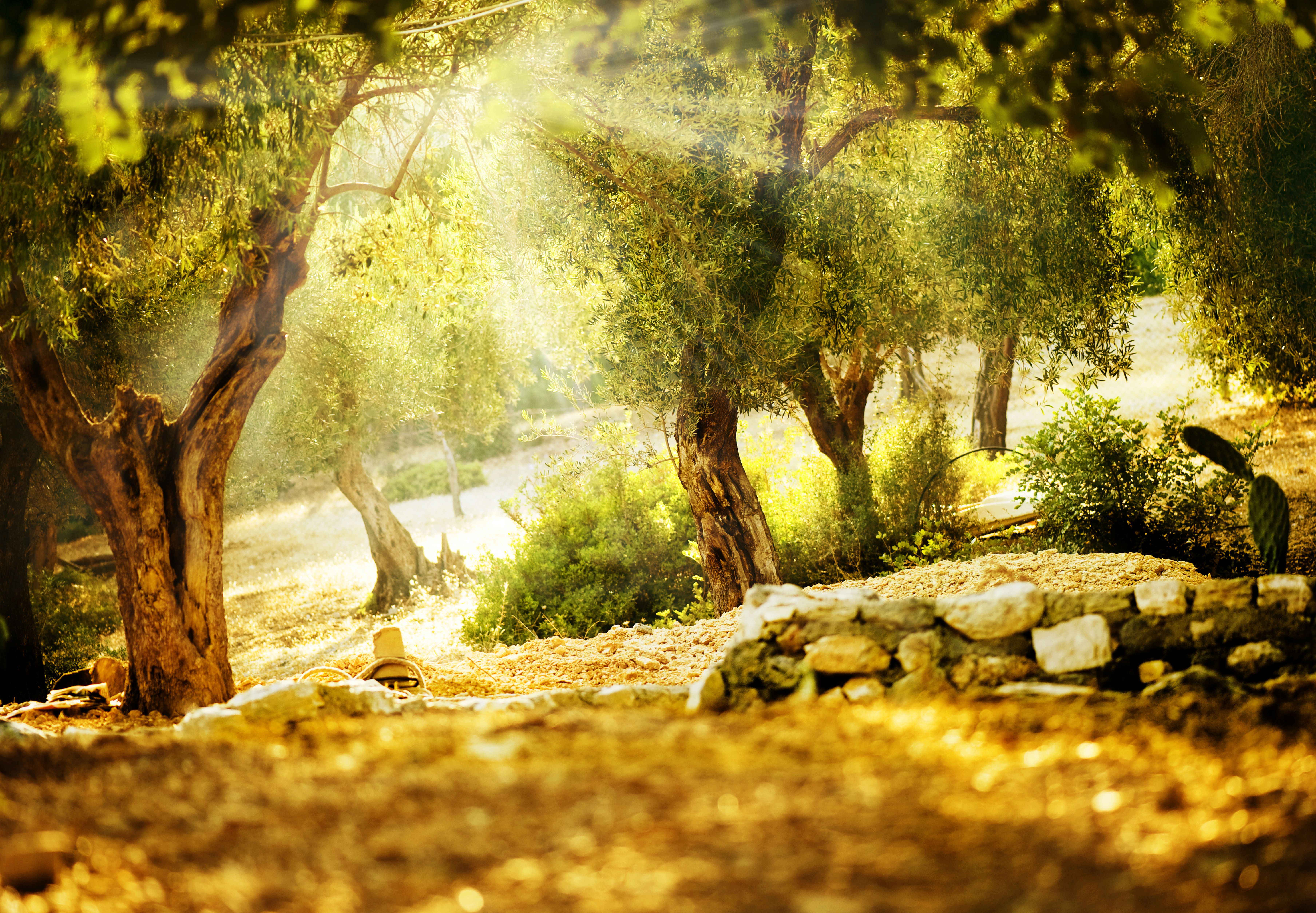 Description: A picture of a park with trees and rocks in the foreground and a path in the background with a stone wall and a stone wall.