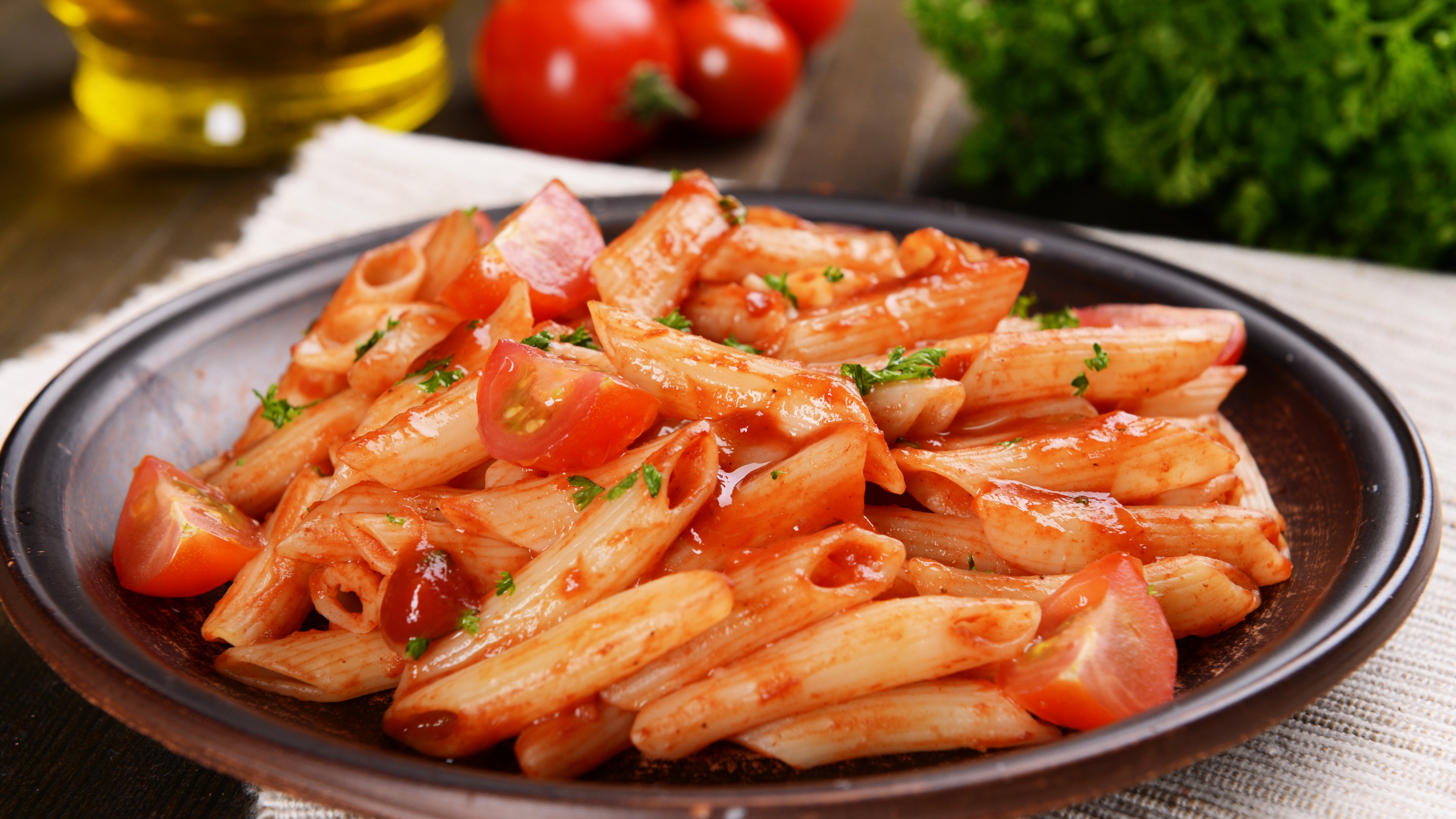 Description: A plate of pasta with tomatoes and sauce on a table with a knife and tomatoes in the background and a bottle of olive oil.