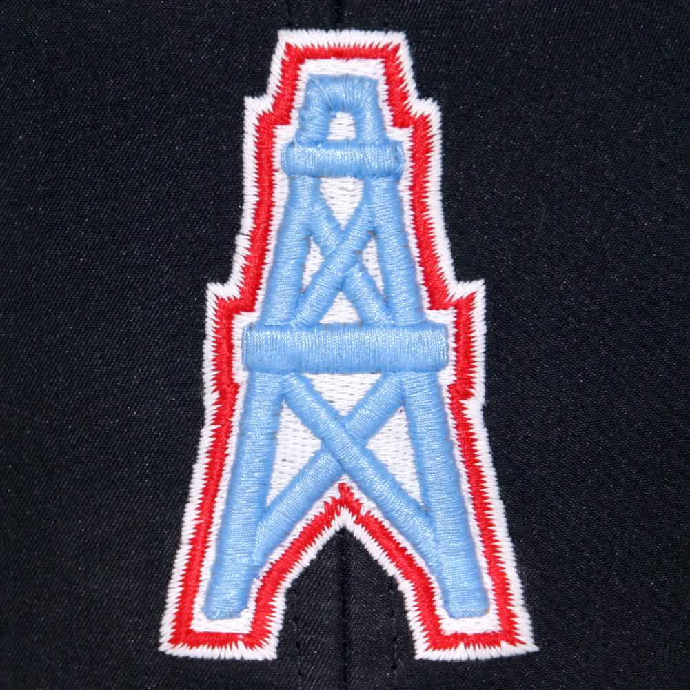 Description: A picture of a patch on a hat with a picture of a tower on it's side and a red white and blue stripe.