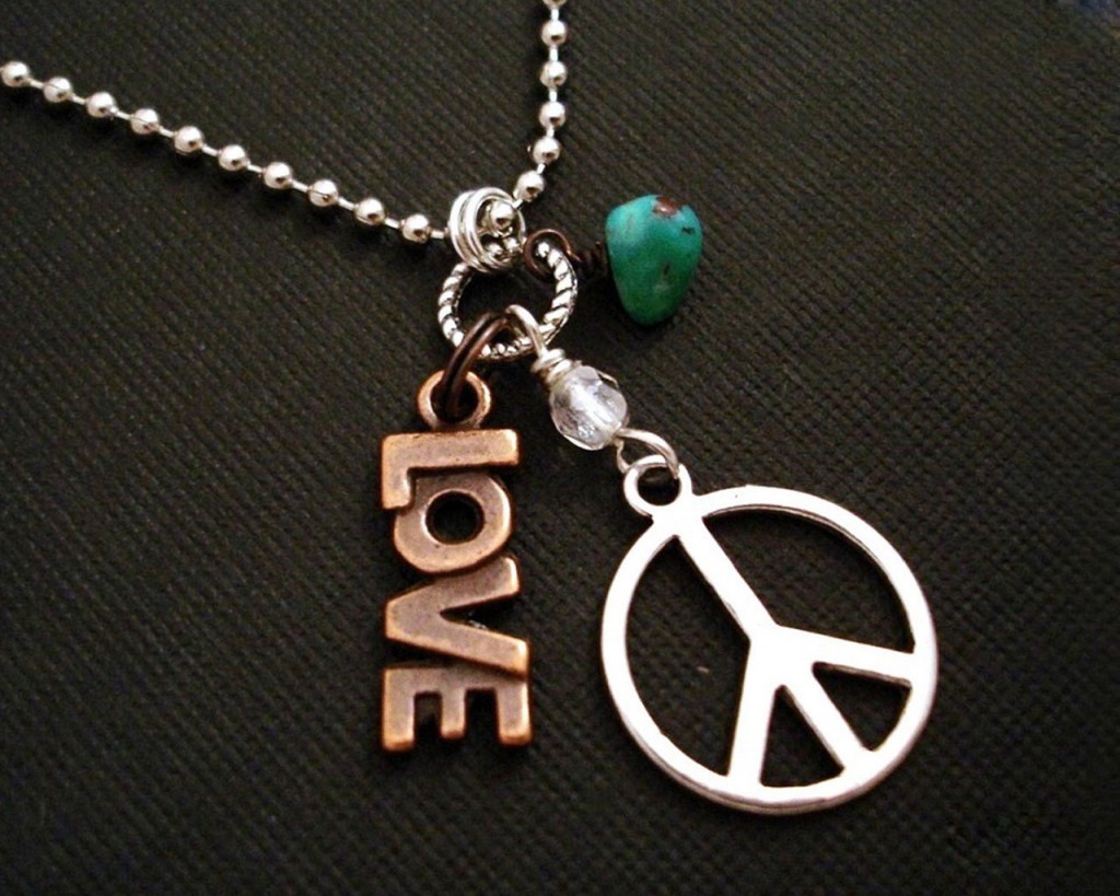 Description: A peace sign and a green bead necklace on a black surface with a silver chain and a green bead.