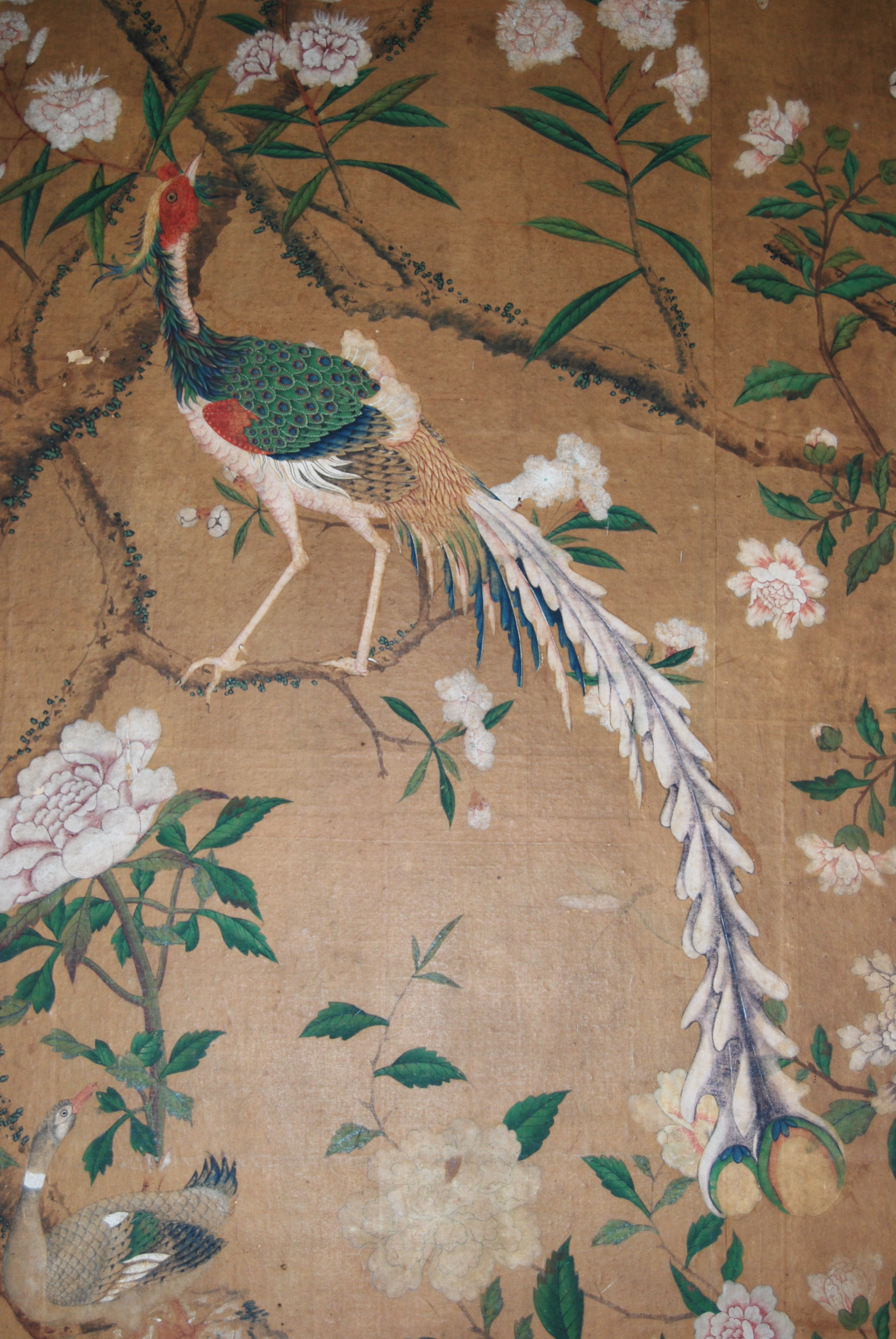 Description: A peacock is standing on a branch of a tree with flowers and leaves on it's side.