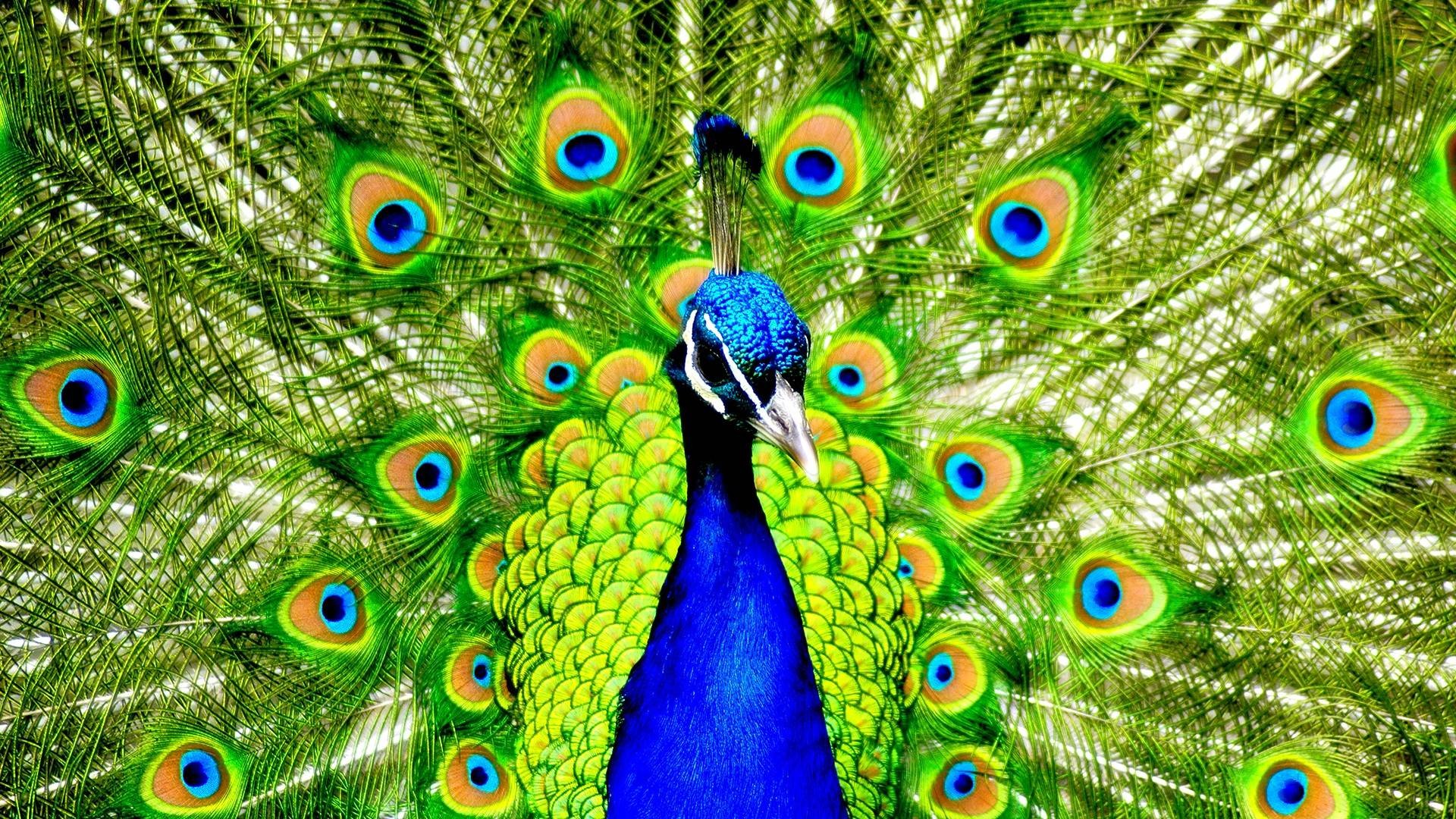 Description: A peacock with its feathers spread out and its tail feathers spread out and its feathers are spread out and the feathers are blue and green.