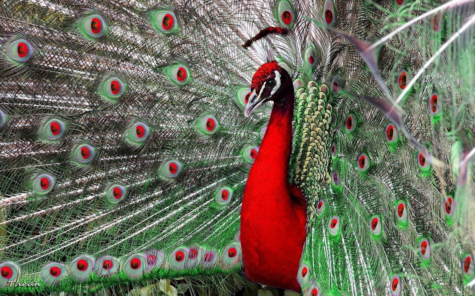 Description: A peacock with its feathers spread out and its tail feathers spread out.