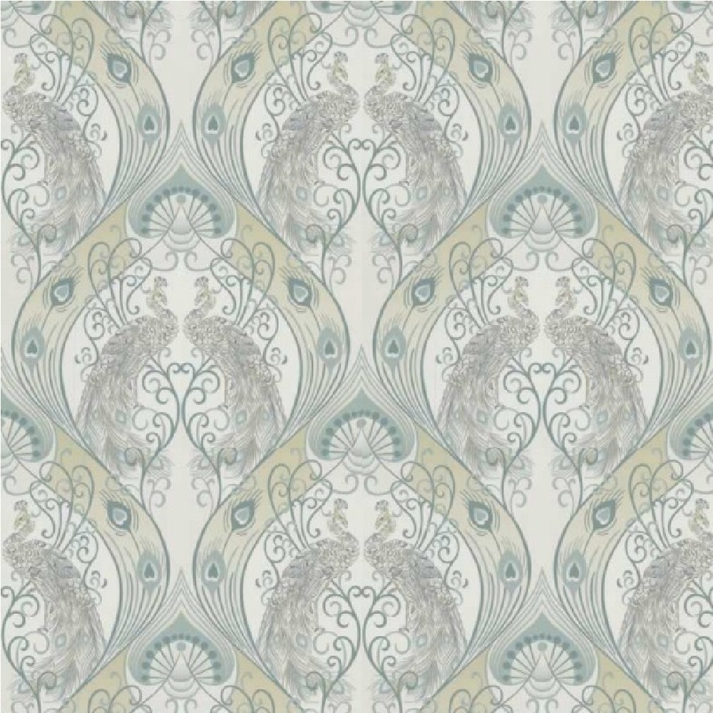 Description: A wallpaper with a peacock design on it's side and a white background with a green and blue design.