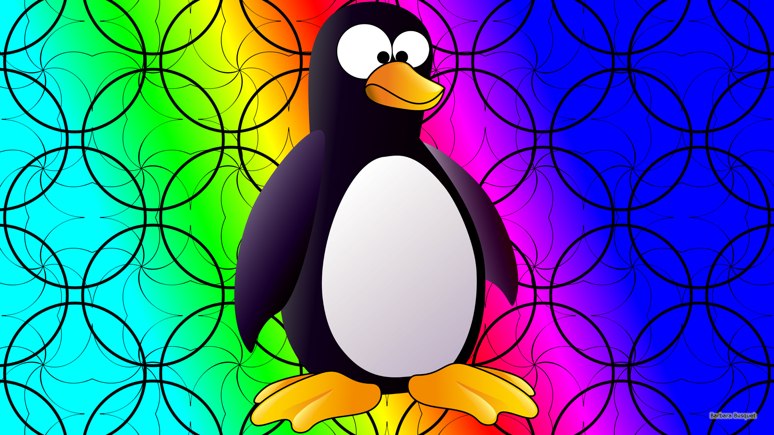 Description: A penguin with a rainbow background and a blue circle pattern on it's side.