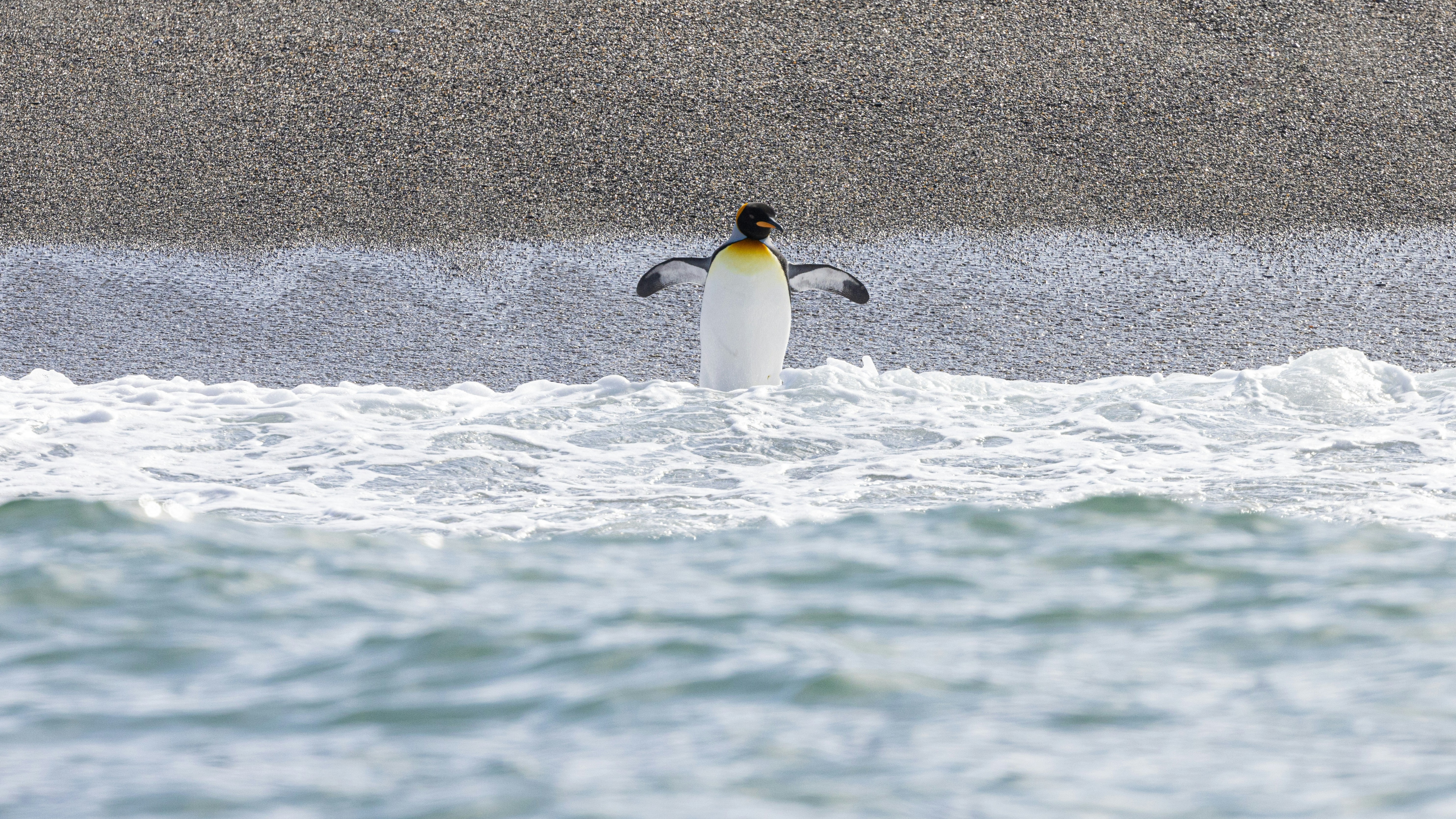 Description: A penguin standing in the water with its wings spread out and its head above the water's surface.