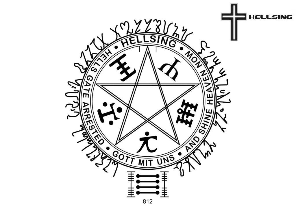 Description: A pentagramus seal with the words hellsing and a cross in the middle of it.