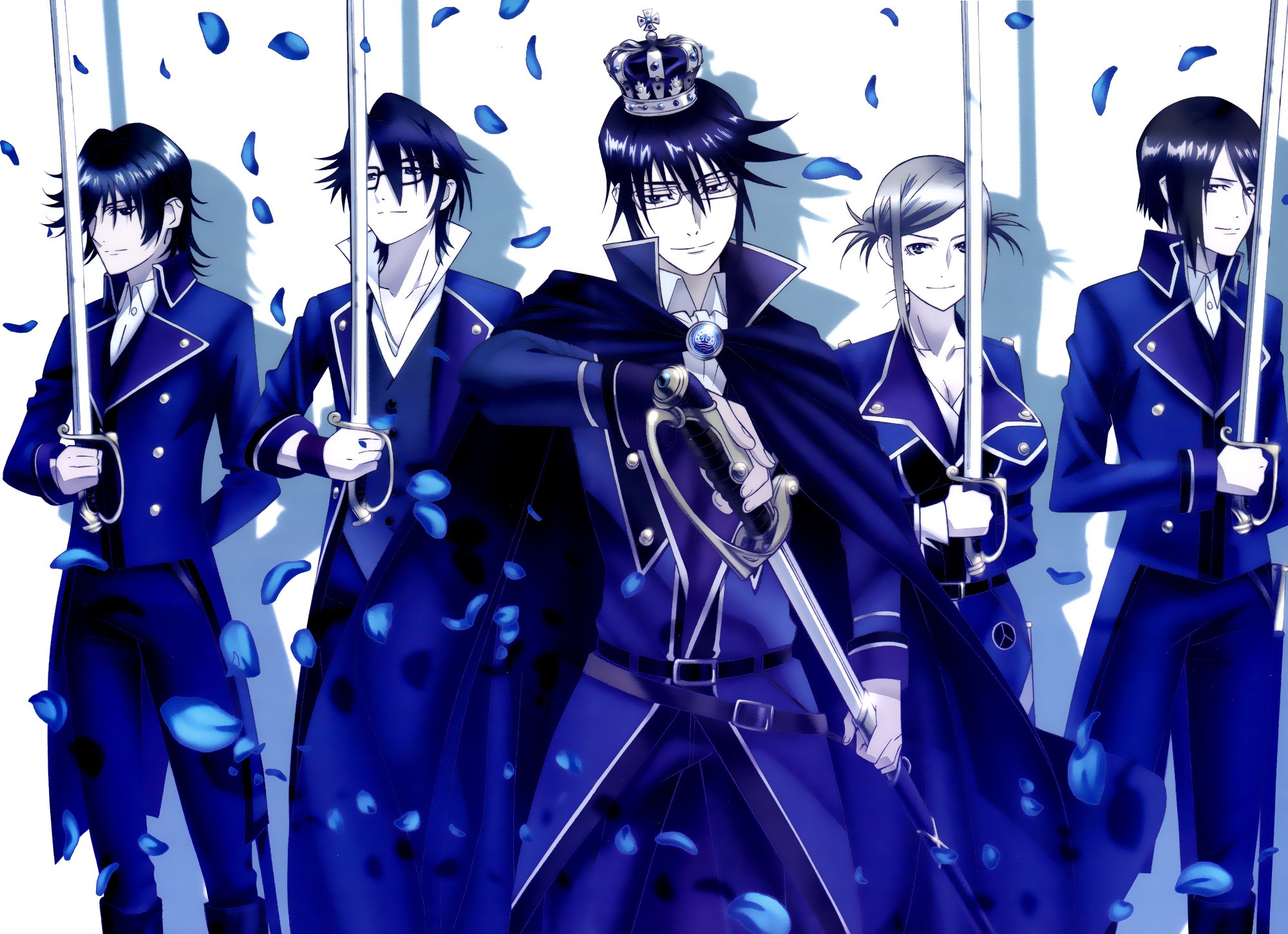 Description: A group of people in blue outfits holding swords and umbrellas in the rain with rain drops falling on them.