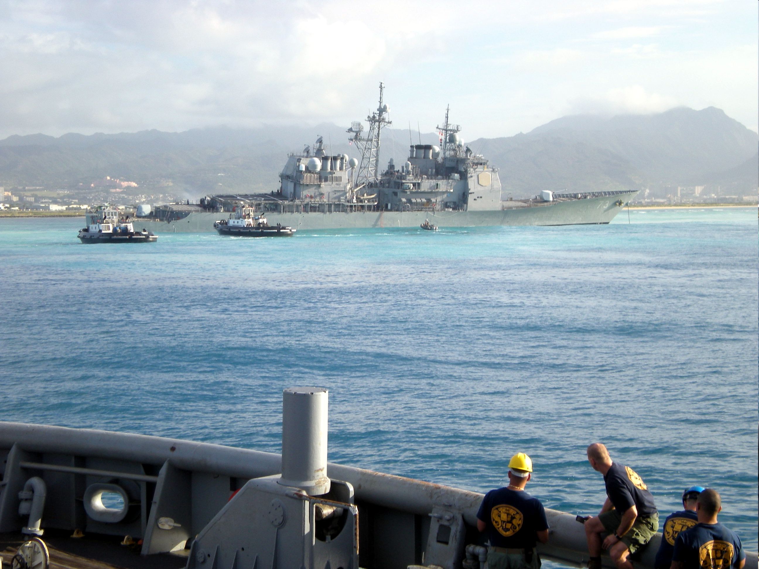 Description: A group of people standing on a boat looking at a ship in the water with another boat in the background.