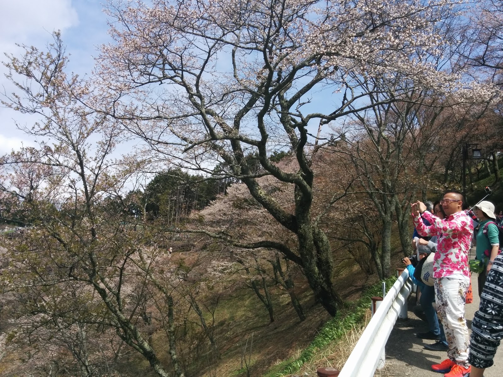 Description: A group of people standing on a bridge next to a river and trees with blossoming blossoms on them.