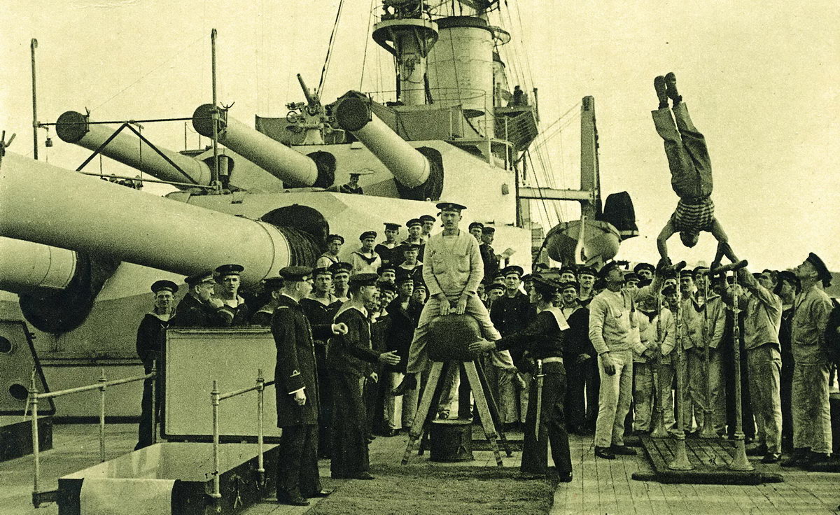 Description: A group of people standing on a dock next to a ship with a cannon on it's side.