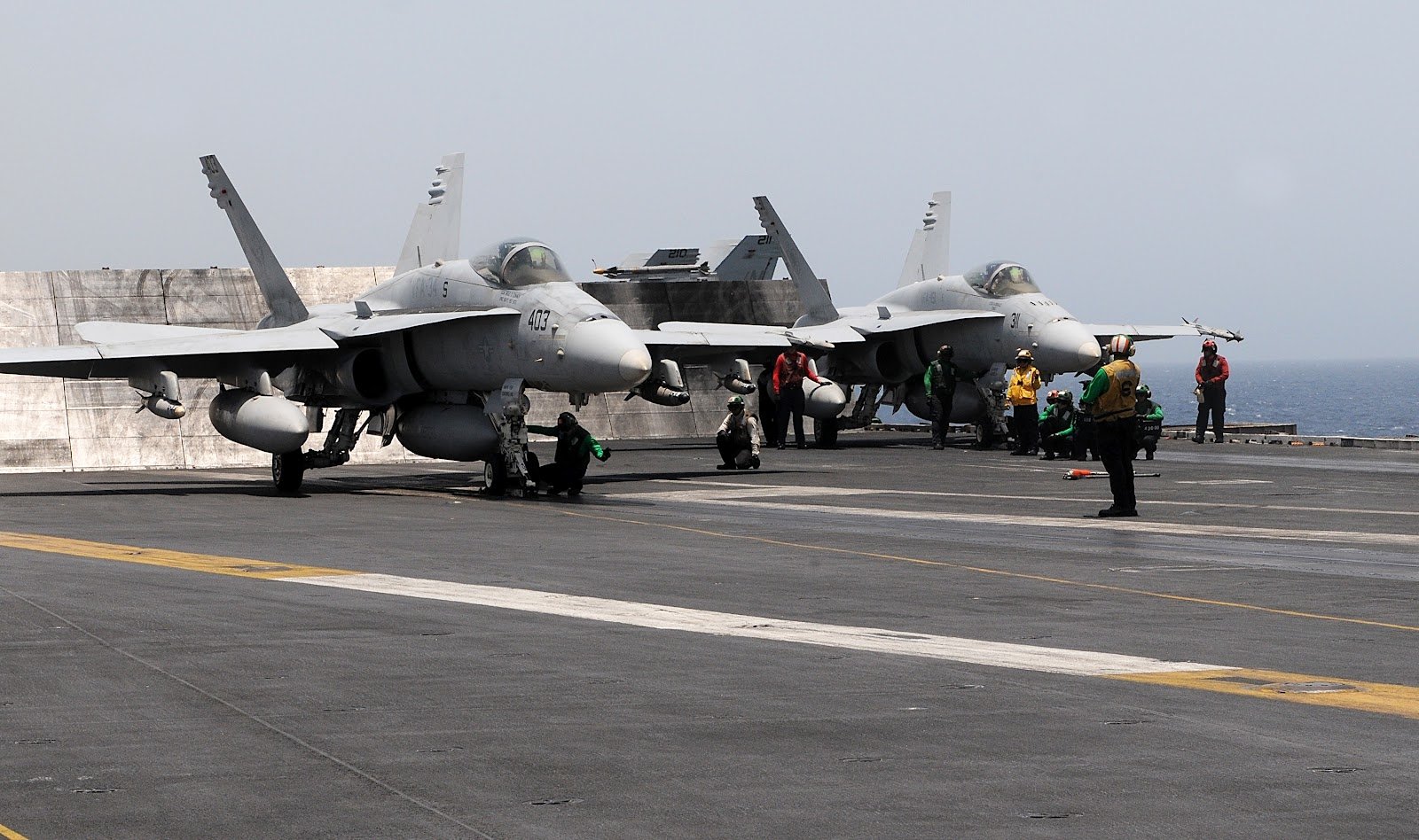 Description: A group of people standing around a fighter jet on a runway near the ocean and a wall with a few planes on it.