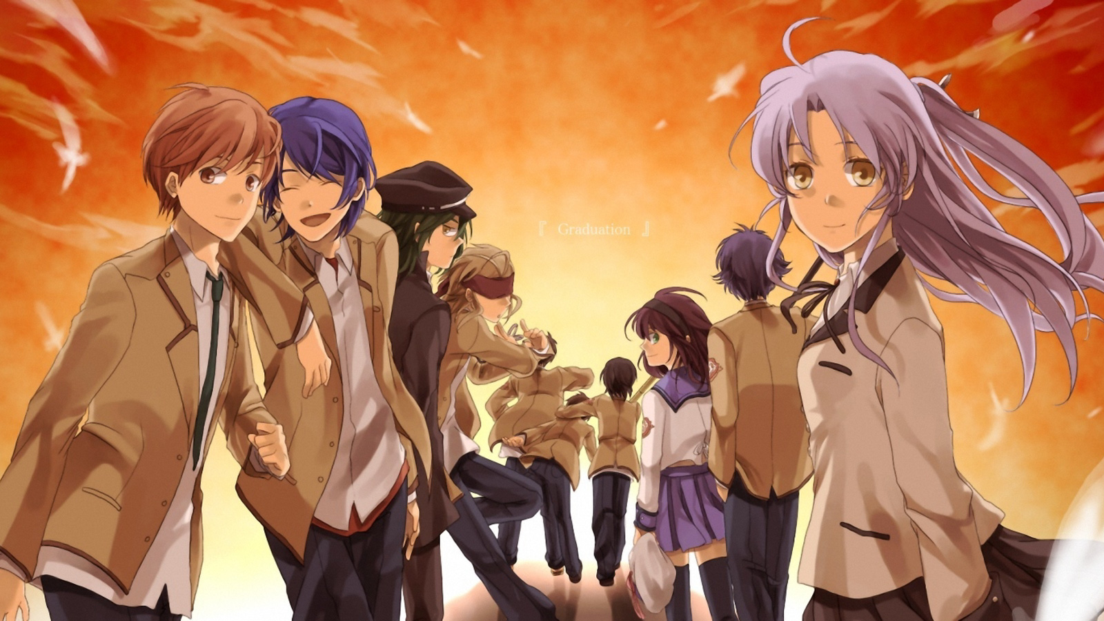 Description: A group of people standing next to each other in front of a fire background with a sky background and a red sky.