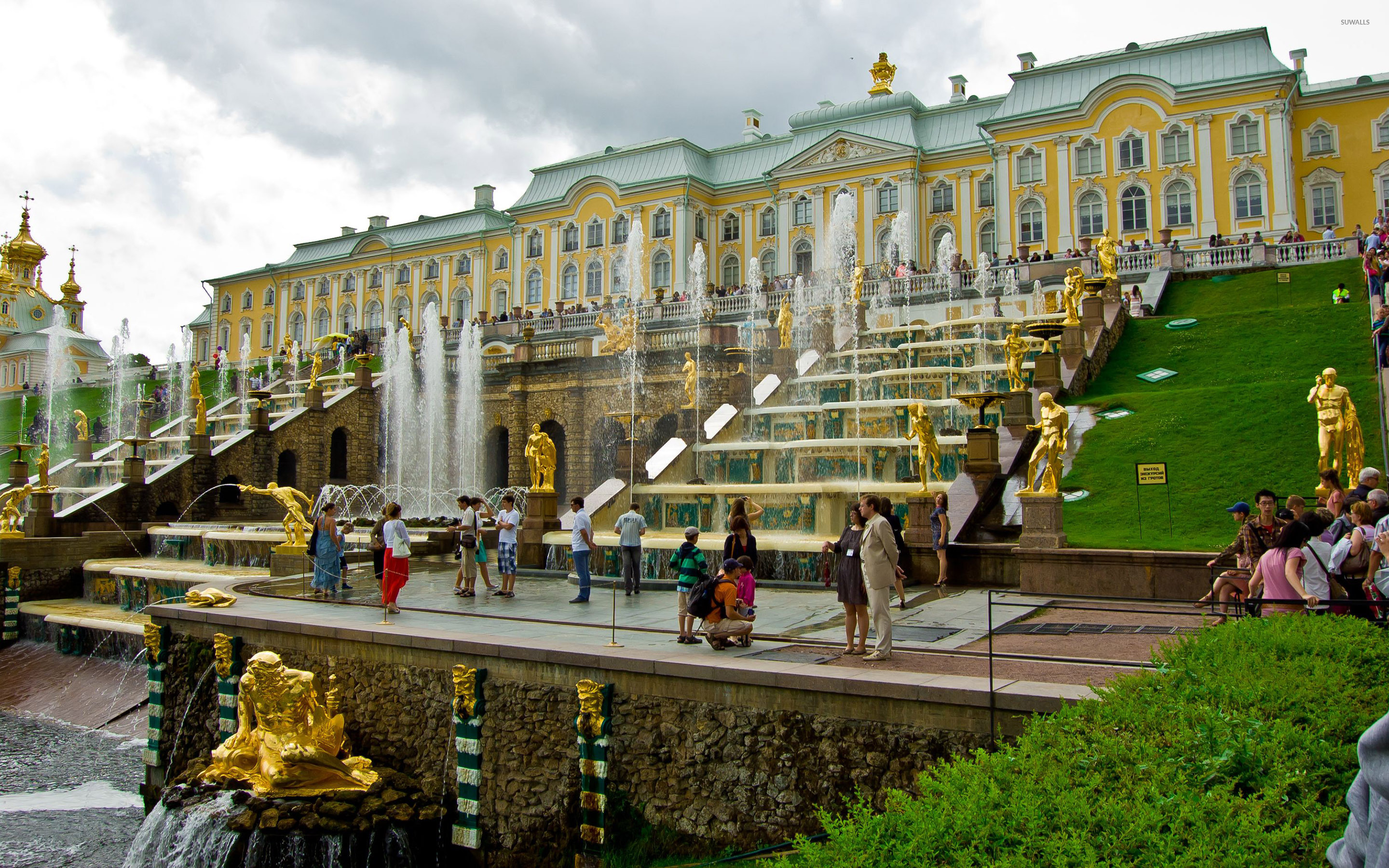 Description: A group of people standing around a fountain in front of a building with a large fountain in front of it.